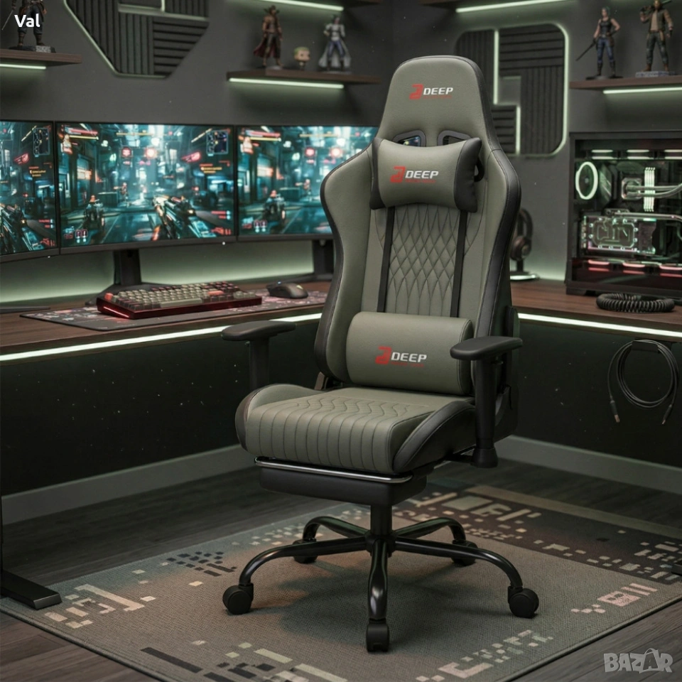 Ергономичен сив геймърски стол с поставка за крака, регулируема височина и 3D подлакътници