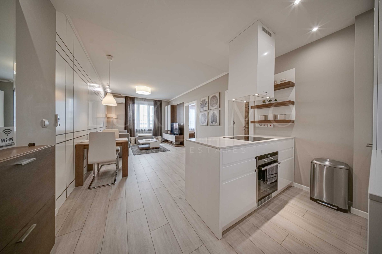 Сърцето на жилището е кухнята с елегантен барплот, който не само е практичен за готвене, но и създава усещане за уютно общуване място, където може да изпиете сутрешното си кафе или чаша вино вечер.