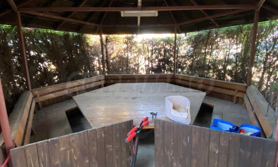 Двуетажна масивна сграда със застроена площ 116 кв.м. На първия етаж са обособени четири офиса, кухненски бокс и санитарен възел. Вторият етаж включва апартамент с четири стаи, баня с тоалетна и лятна тераса, оборудвана с барбекю и кухня. На таванския етаж се намира самостоятелен апартамент със санитарен възел.