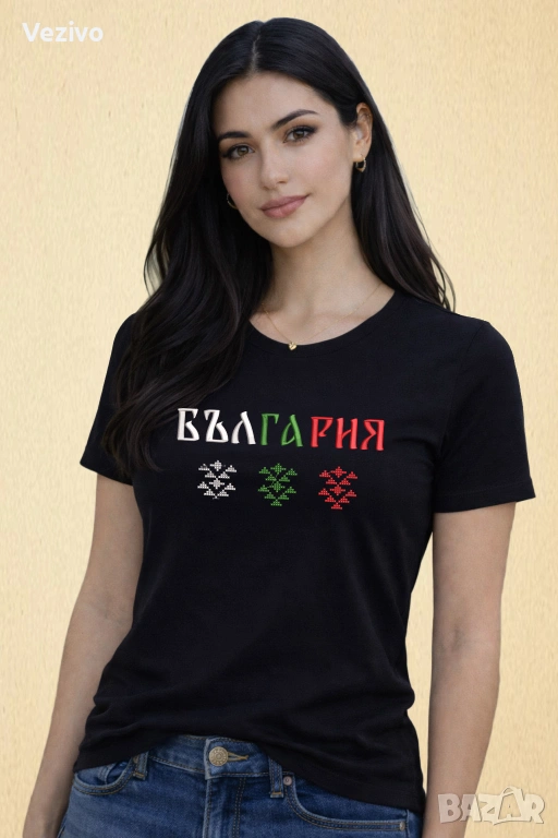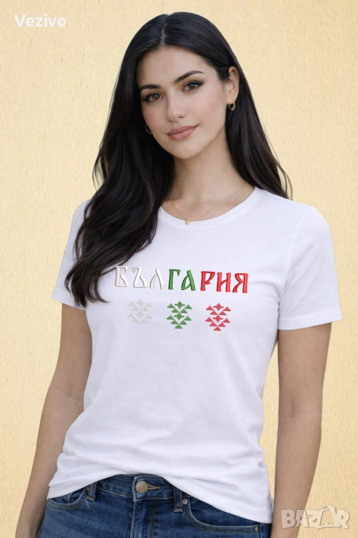 Стилна бродерия с надпис „България“ в цветовете на националния трибагреник, допълнена с традиционен фолклорен мотив. Комбинацията от бяло, зелено и червено носи усещане за принадлежност, традиция и гордост.