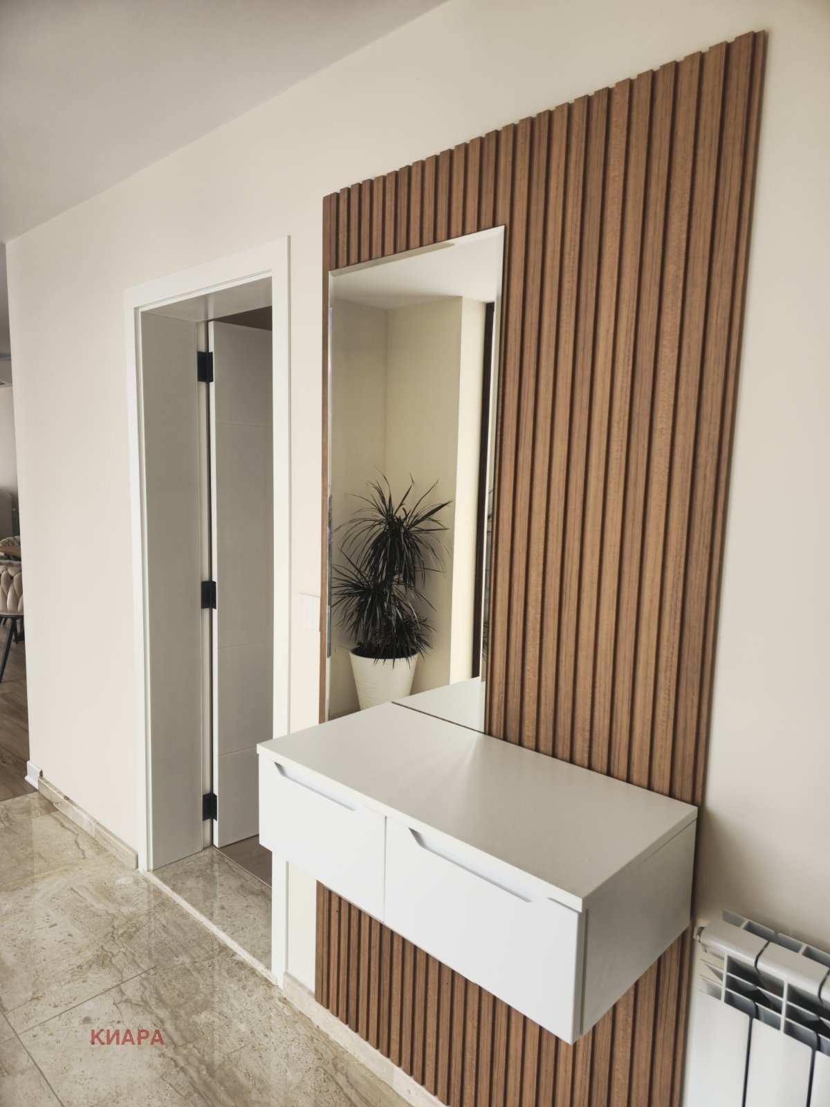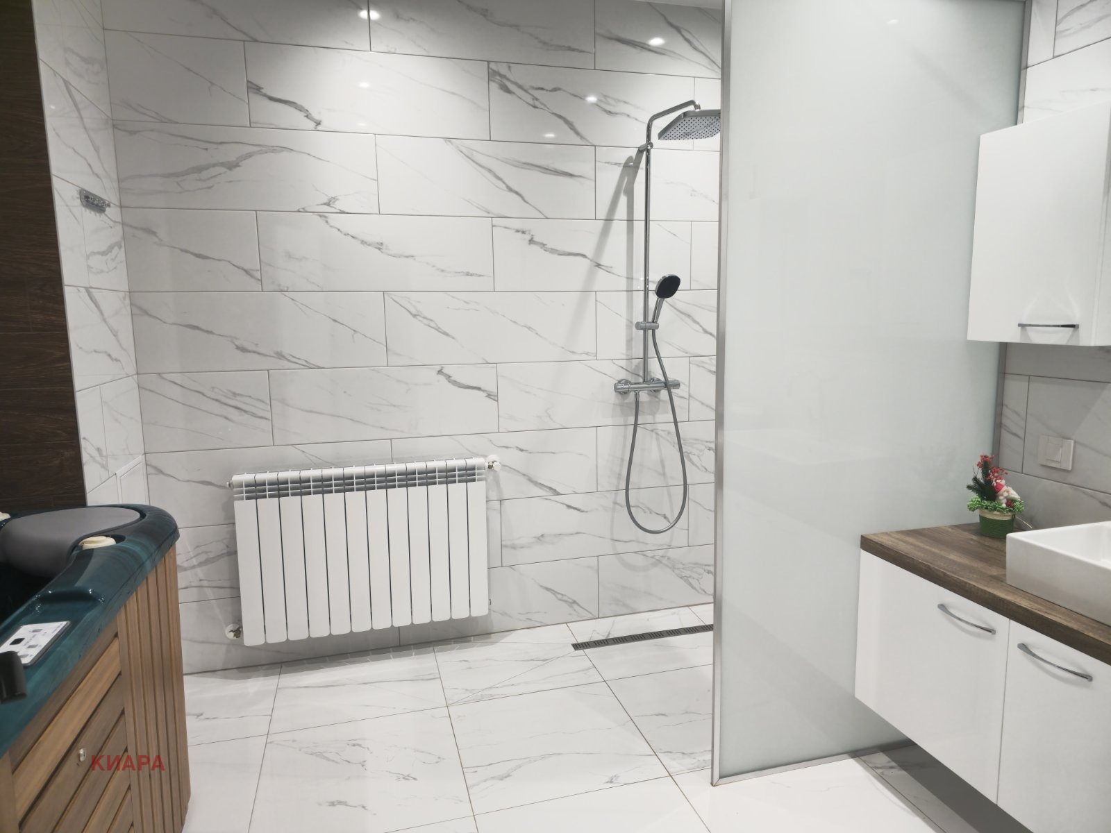 Елегантна и просторна дневна и трапезария с камина и директен достъп до басейна, стилна кухня с висок клас уреди, спалня със собствена баня и тераса, втора спалня, санитарно помещение вестибюл (антре) за връхни дрехи и обувки.