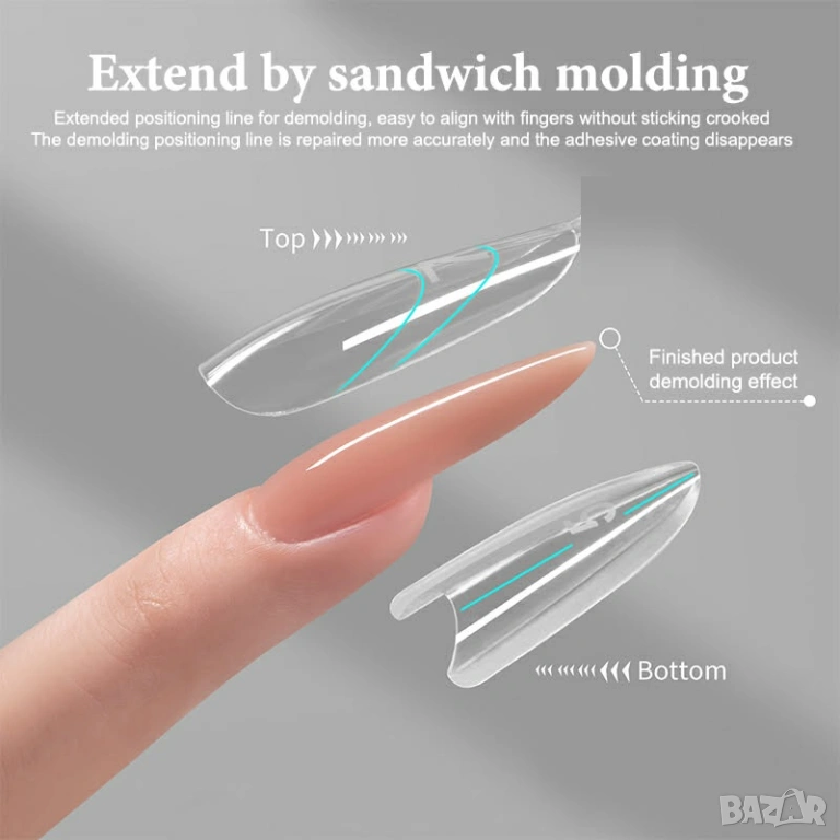 Добавете изграждащ или екстеншън гел върху горната форма и я поставете внимателно.