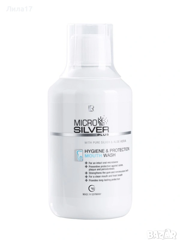 Водата за уста на LR е с уникално действие. MICROSILVER PLUS Hygiene & Protection, е специализиран антибактериален продукт, за цялостна хигиена и защита на устната кухина. Тя се отличава със своята гелообразна консистенция, която създава защитен филм върху зъбите и венците. Основни предимства Премахва до 99,9% от микробите: Ефективна срещу бактерии и вируси благодарение на активната съставка MicroSilver BG™ (чисто сребро с пореста структура). Дълготрайно действие: Осигурява защита и свеж дъх до 12 часа след употреба. Грижа за венците и емайла: Помага за предотвратяване на плака, кариес и пародонтоза, като същевременно реминерализира зъбите чрез натриев флуорид. Балансира микробиома: Поддържа естествената флора в устата, без да предизвиква чувство на парене. Ключови съставки MicroSilver BG™: Антибактериално и противовъзпалително действие. Гел от Алое Вера (15%): Успокоява венците и засилва ефекта на среброто. Ксилитол: Възпрепятства развитието на бактерии и киселинни атаки. Ментол и мента: Осигуряват интензивно усещане за чистота и свежест. Начин на употреба Използвайте два пъти дневно – сутрин и вечер – след миене на зъбите. Жабурете около 30 секунди с приблизително 5 мл от течността (една дозираща капачка), след което изплюйте. Не изплаквайте с вода веднага след това, за да позволите на защитния слой да подейства.