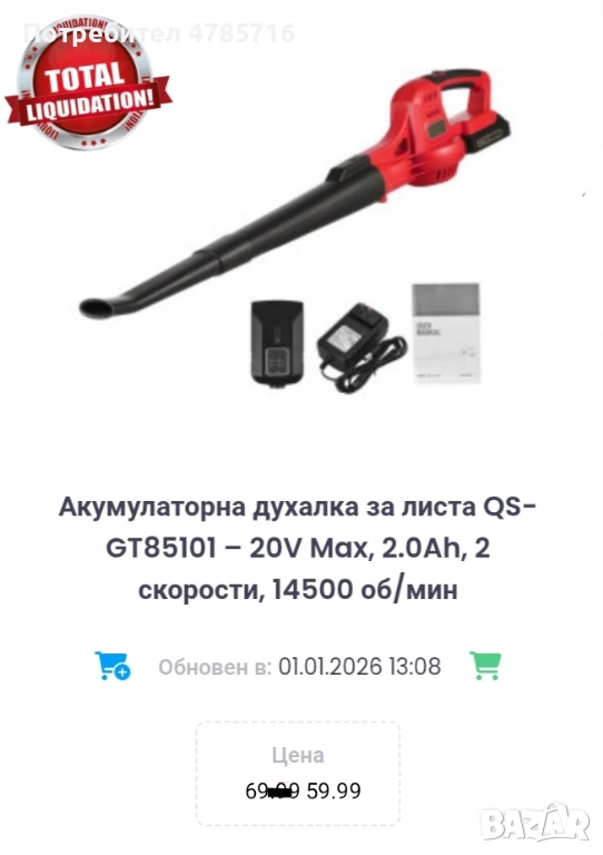 Акумулаторна духалка за листа QS-GT85101 – 20V Max, 2.0Ah, 2 скорости, 14500 об/мин → Обява 54069411