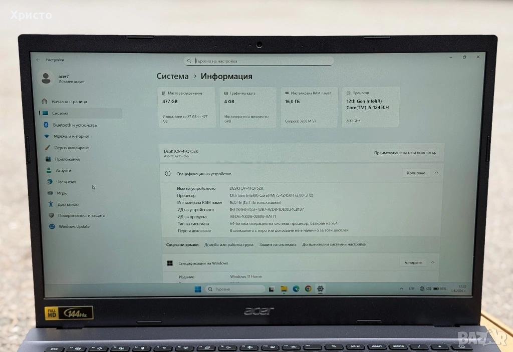 • Модел: Intel Core i5-12450H
