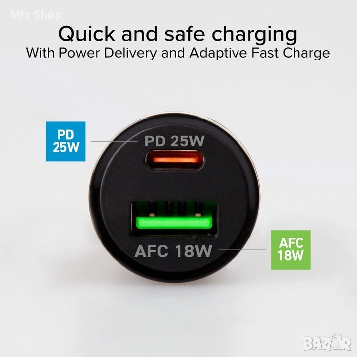 Зарежда до 2 устройства едновременно 1 25 W USB-C порт с технология Power Delivery (PD) 1 18 W USB-A порт с технология за адаптивно бързо зареждане (AFC). свръхбързо зареждане: смартфонът се зарежда за 35 минути, а таблетът за 70 LED индикатор за състоянието
