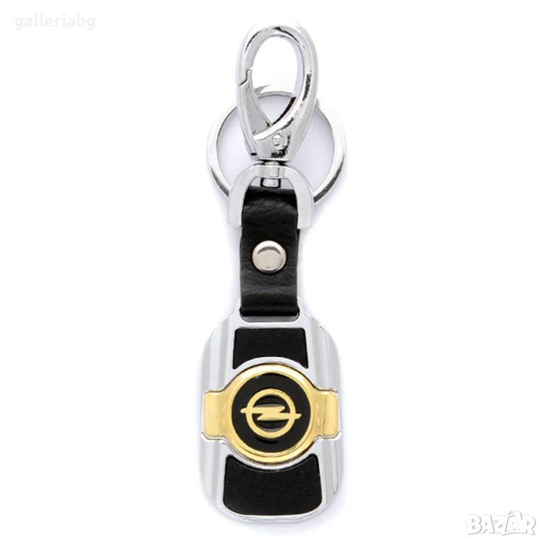 Стилен автомобилен ключодържател Opel в златно и сребърно, с метална пластина и кожена каишка – по-отличаващ се и премиум визия.