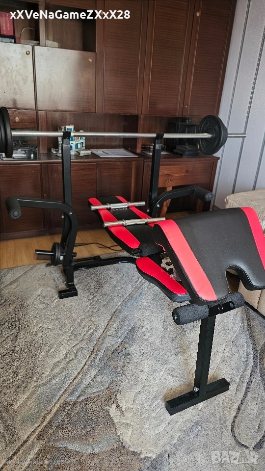 Мултифункционална лежанка с пълен комплект тежести за домашен фитнес. Подходяща за различни видове тренировки и упражнения. Компактен и удобен дизайн, лесен за съхранение и транспортиране.