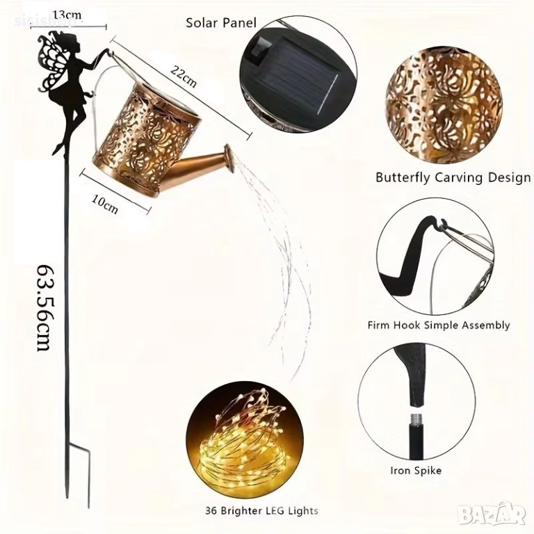 Търсите оригинален подарък, който ще превърне всяка градина в приказна сцена? Този соларен комплект съчетава изяществото на метална фигура „Фея“ с очарованието на светеща лейка, която имитира течаща вода чрез 36 блещукащи LED светлинки. Изработена от устойчиво ковано желязо, декорацията проектира нежни фигури на пеперуди, създавайки уютна и романтична атмосфера веднага щом се стъмни. Напълно автоматизирана и лесна за монтаж, тя е идеалното допълнение за цветни лехи, алеи или специални кътове в двора.