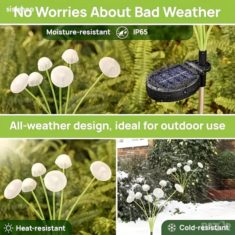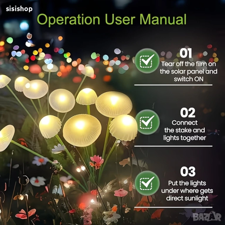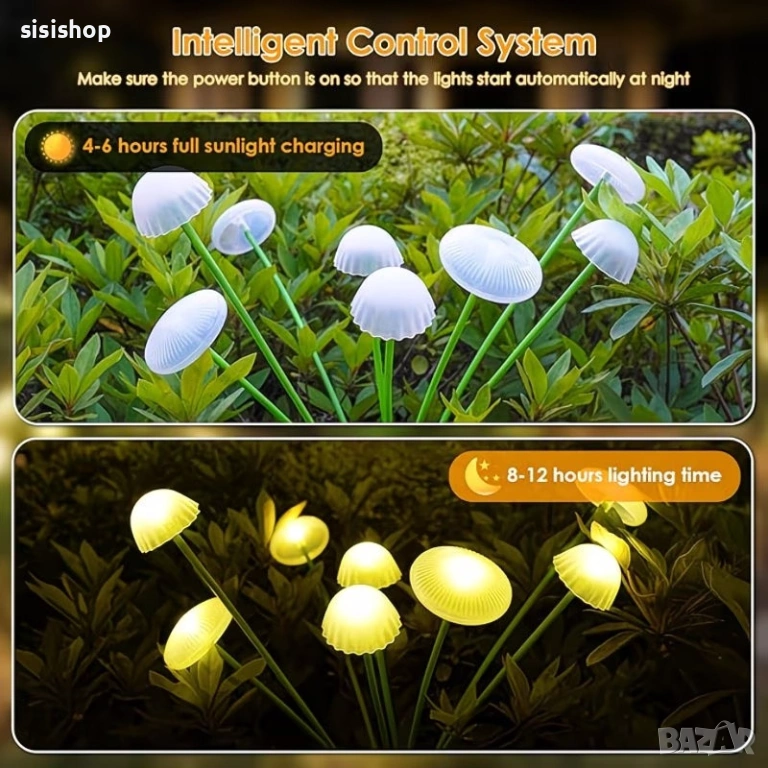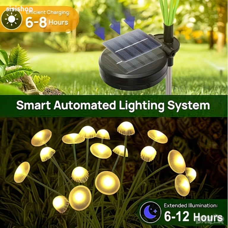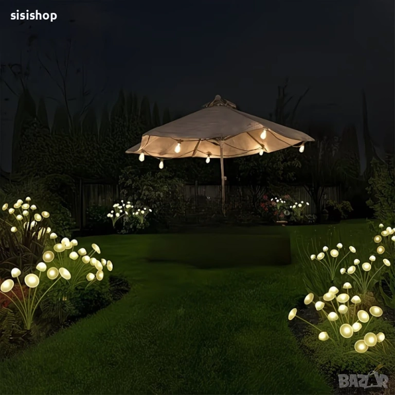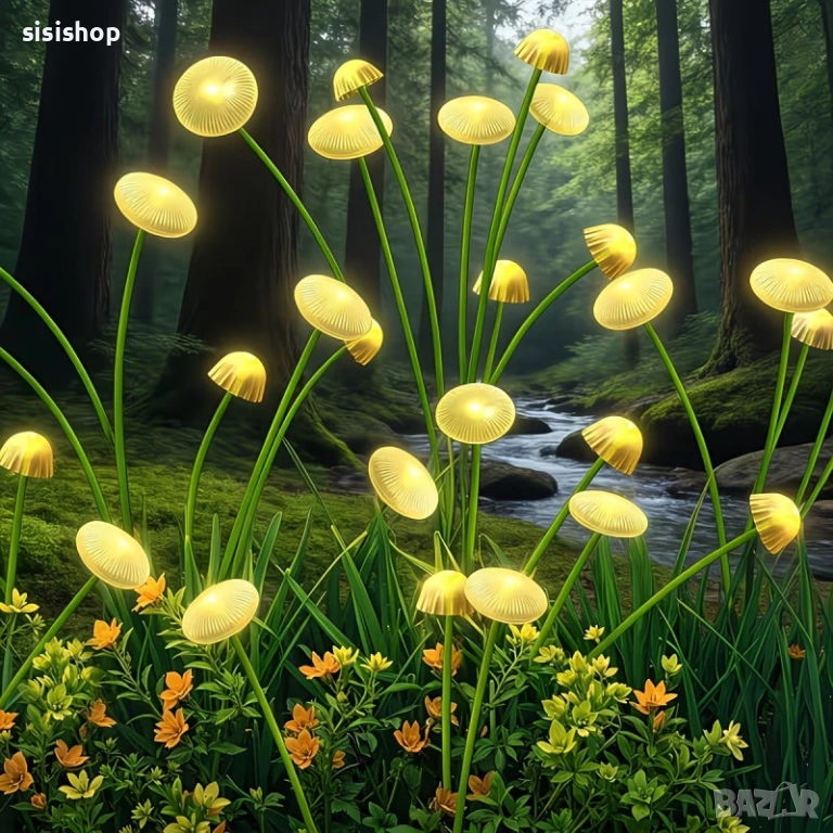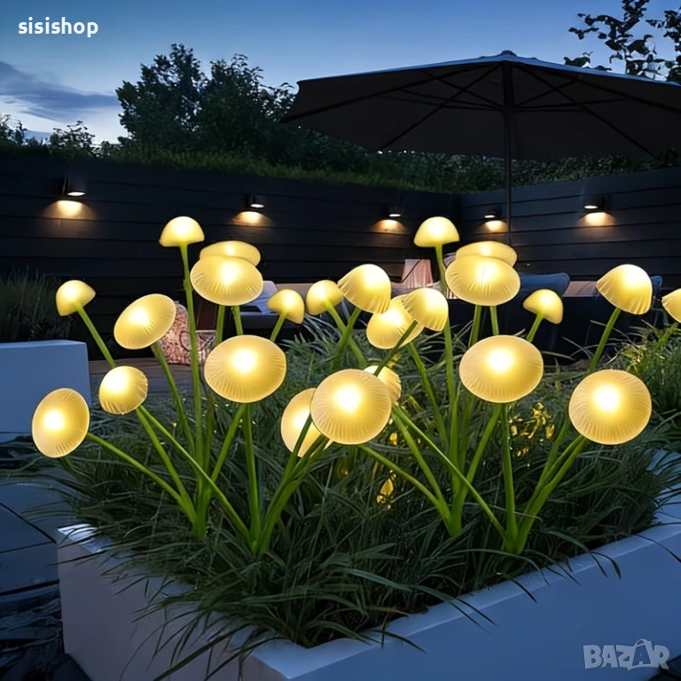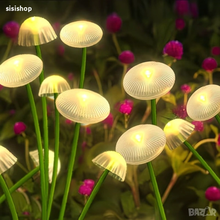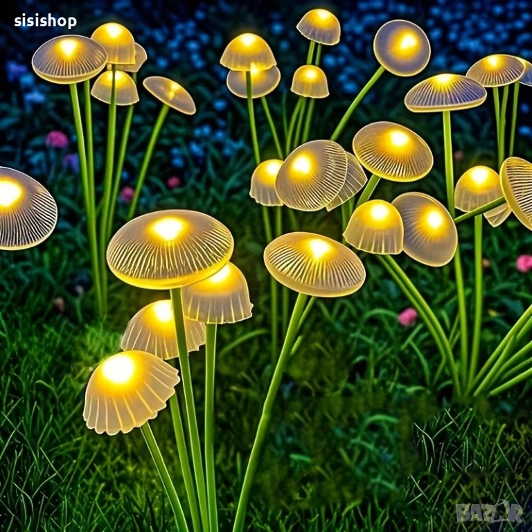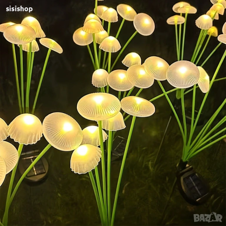 Декоративна соларна лампа за градина с ефектен дизайн Медузи и Гъбки, подходяща за цветни лехи, алеи и дворни пространства. Лампата се зарежда от слънцето, включва се автоматично при здрач и създава мека топла жълта светлина за уютна вечерна атмосфера. Комплектът включва 1 брой лампа , като моделът се предлага във варианти с 6 LED лампички или 10 LED лампички .