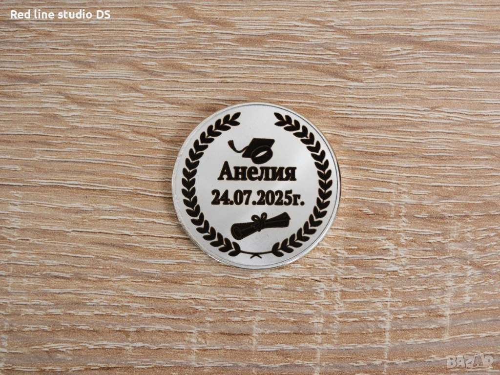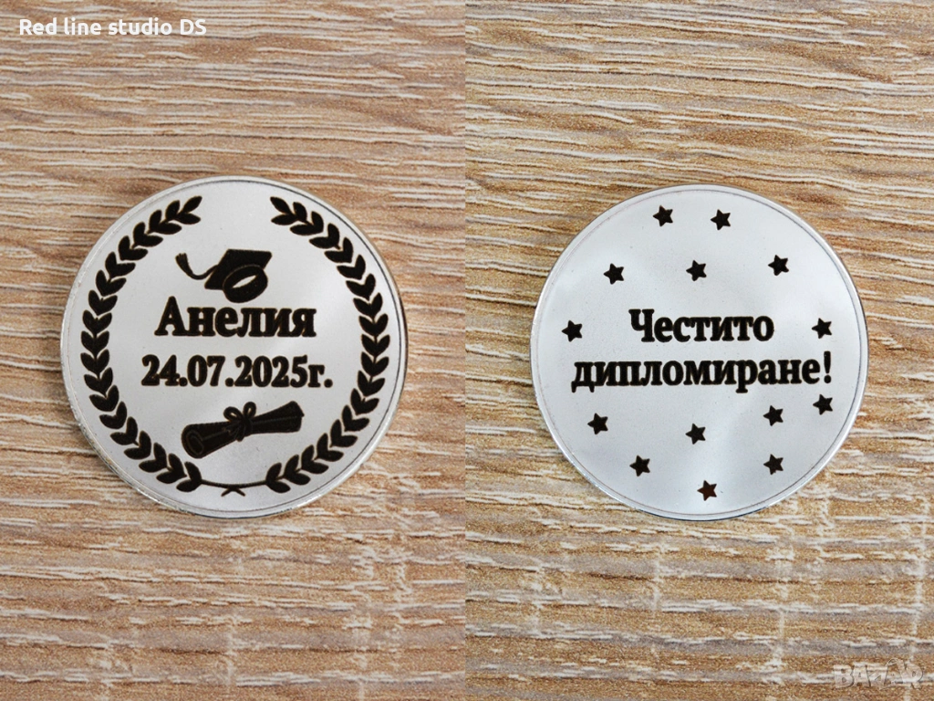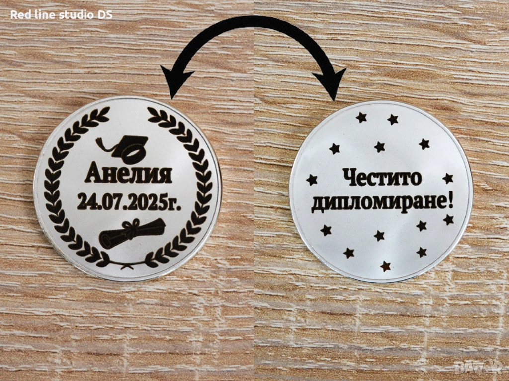 Персонализиран сувенирен медал за дипломиране с гравюра на име и дата. Метален, 38 мм, със зърнист гурт, двустранен дизайн и защитна капсула – стилен и запомнящ се подарък.