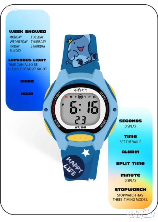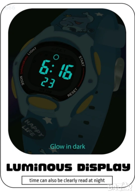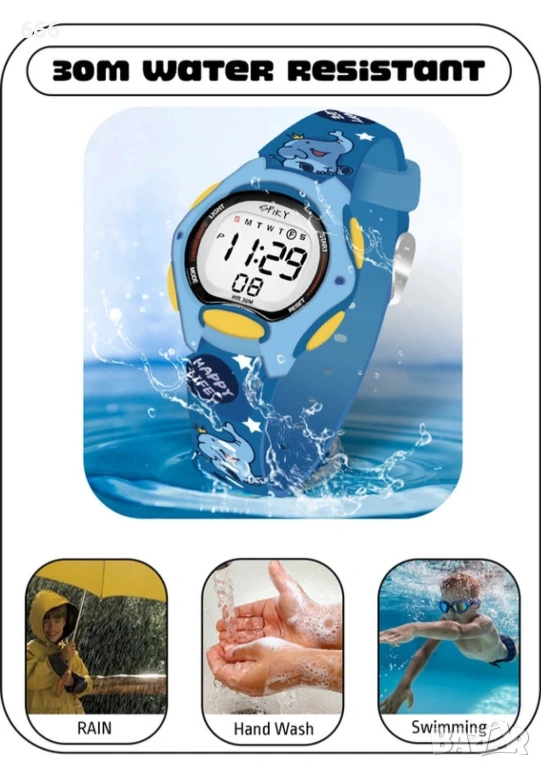 [Водоустойчивост до 30 метра] Уверете се, че детският часовник Spiky Digital на вашето дете няма да се повреди от случайно излагане на вода! Този часовник е водоустойчив до 30 метра.