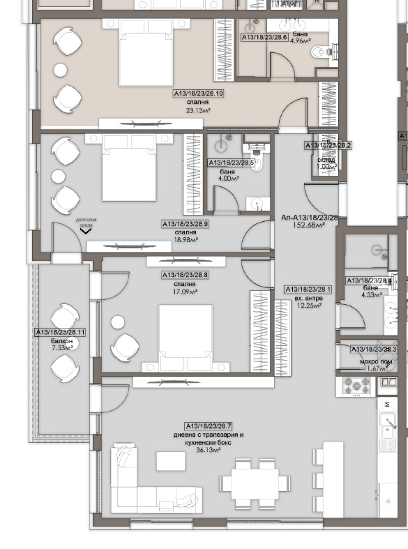 Просторен светъл и уютен четиристаен апартамент, отговарящ на всички изисквания за един съвременен дом. Апартамент А13 на схемата. Удобно и функционално разпределение, големи, комфортни и светли помещения. Чиста площ 152,68кв.м., площ с общи части 175,23кв.м. Възможност за пълноценно и безкомпромисно обзавеждане на всички помещения. Изложение юг и запад.