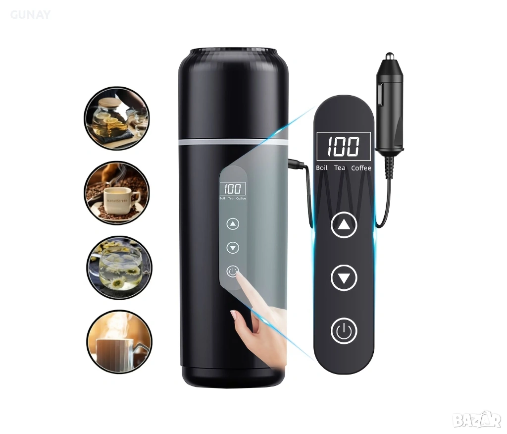 Представяме ви иновативен електрически кетъл, термокана за автомобил и камион. Това е перфектната преносима термочаша за дълги пътувания, къмпинг или за професионални шофьори. С нея можете лесно и удобно да приготвите кафе или чай по всяко време на пътя, директно от запалката на превозното средство. Уредът е перфектен и за прецизно затопляне на мляко за бебета по време на пътуване!