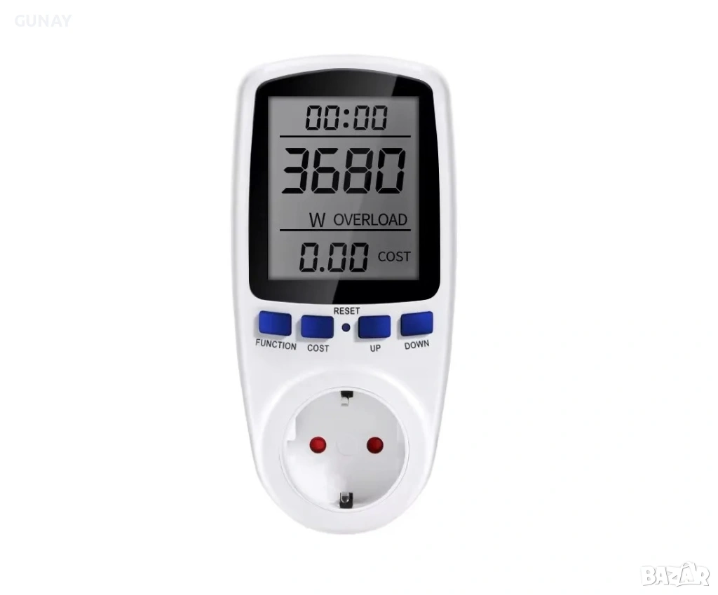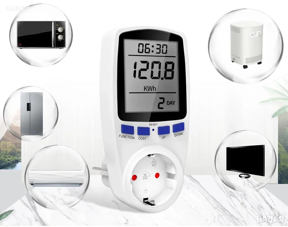Дигитален LCD ватметър и енергомер за контакт (стандартен европейски щепсел). Този измервателен уред е идеален за следене на консумацията на електроенергия на вашите домашни електроуреди. Помага ви да оптимизирате разходите си за ток, като показва в реално време консумираната мощност, напрежение, ампераж и обща цена на изразходваната енергия. Разполага със защита от претоварване и предлага 7 различни режима на изобразяване на информацията върху екрана.