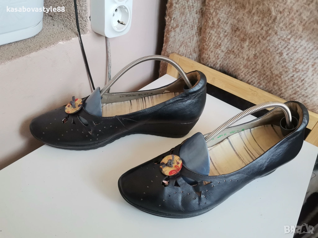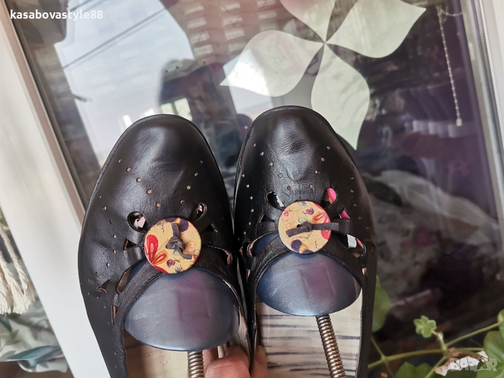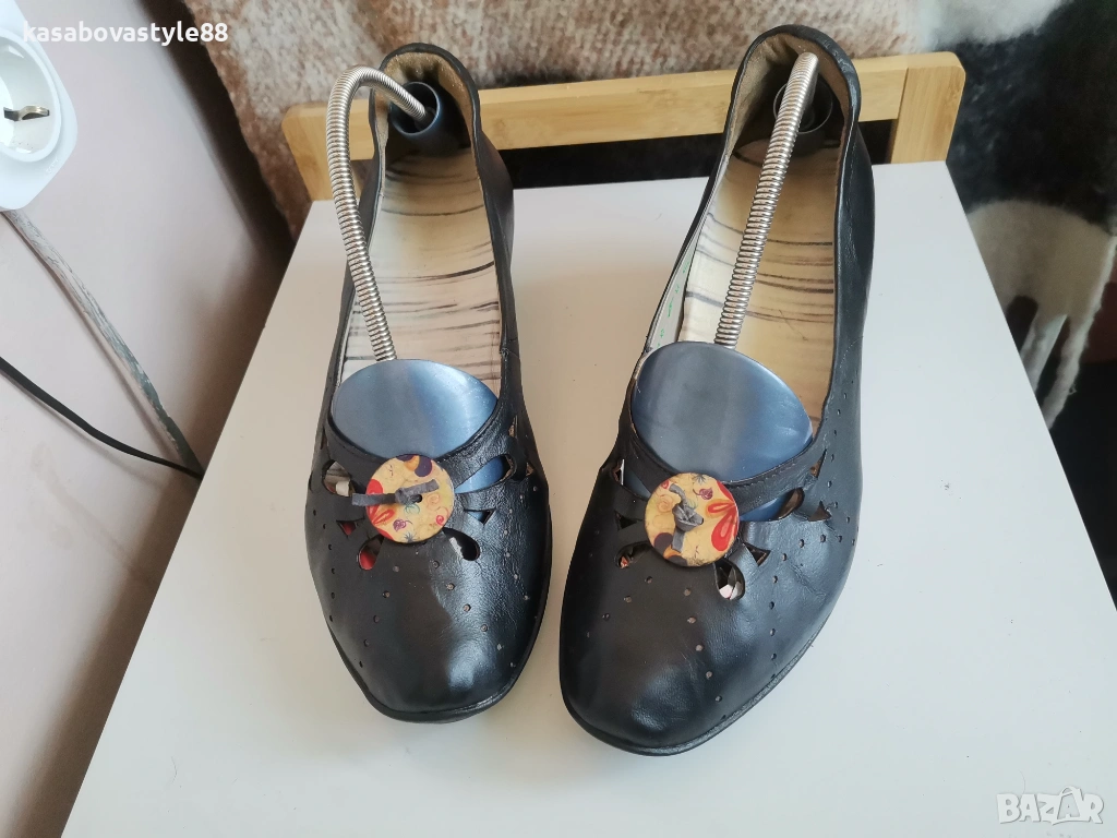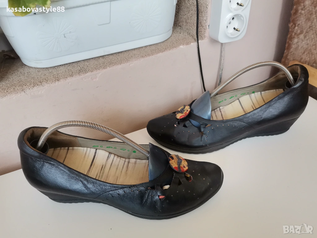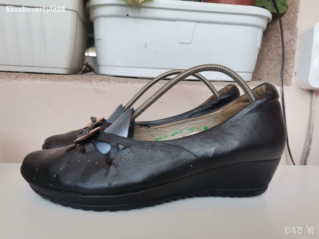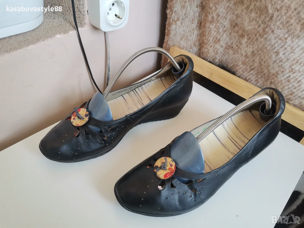 Дамски висококачествени комфортни обувки подходящи както за ежедневието така и за официални поводи. Перфектни както отвътре така и отвън. Изработени от естествена кожа, включително и вътрешната част. Отпред са декорирани с флорални копче. Разполагат с много мека подвижна стелка,която при нужда може да се вади,гарантирайки мекота и оптимална опора при движение Ток- 4 см а горната част-5.5см.Дължина на стелка 26.5-6см.