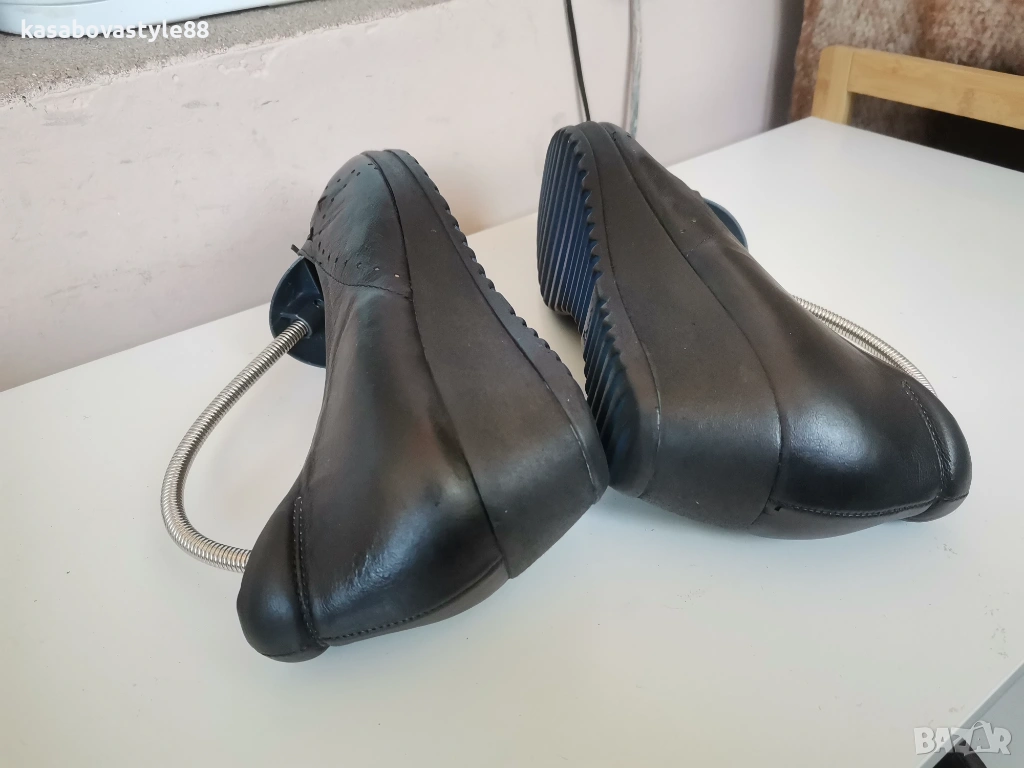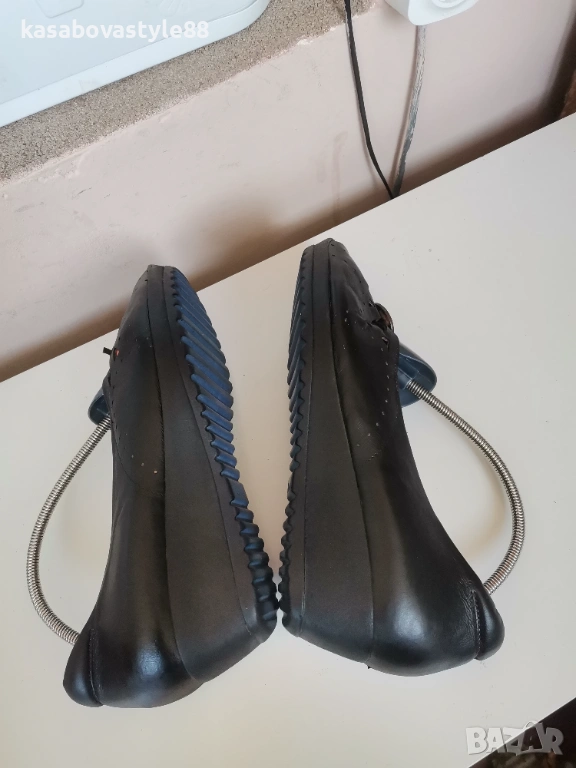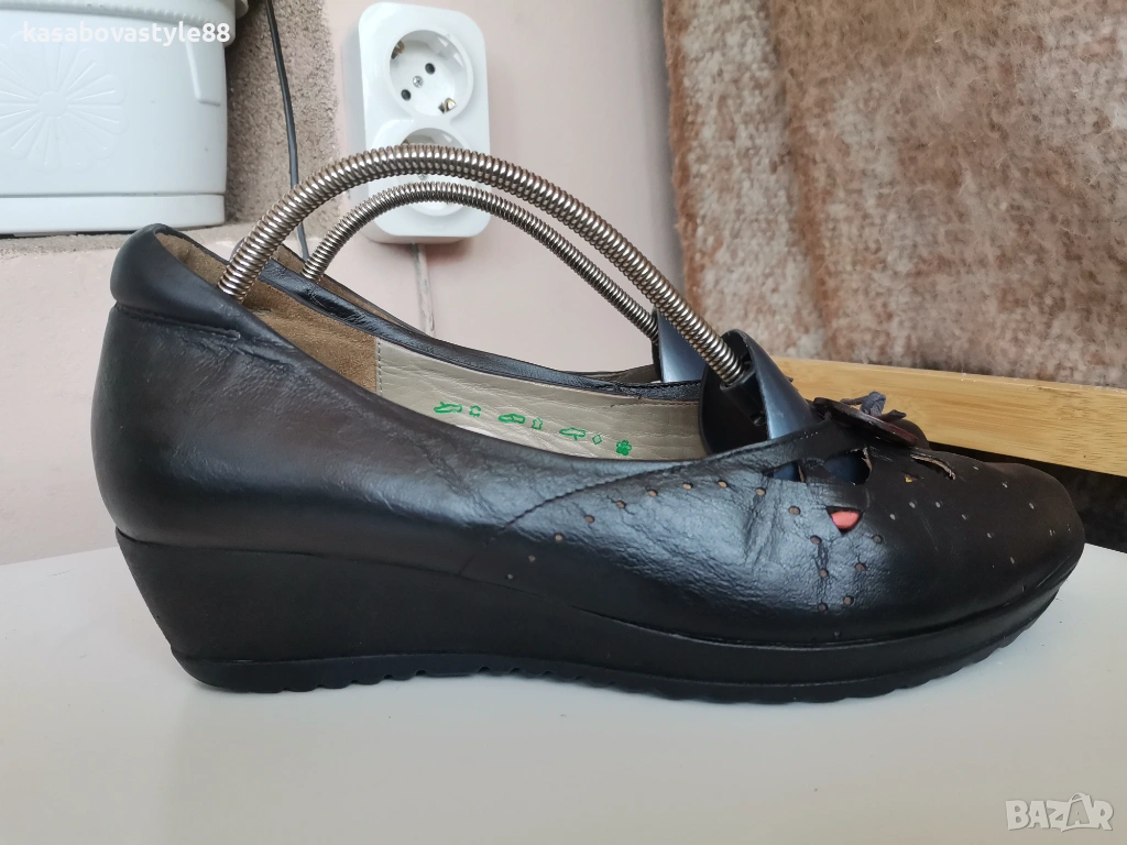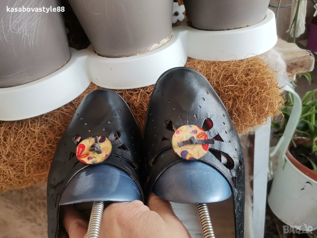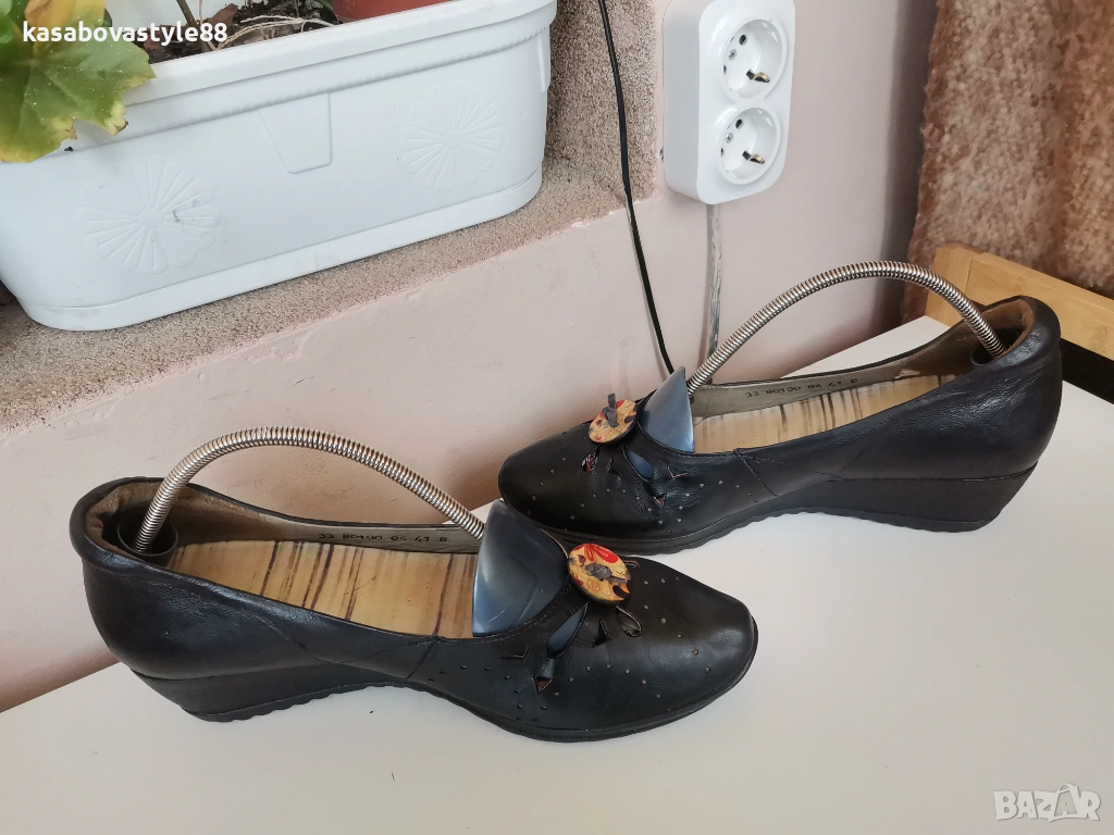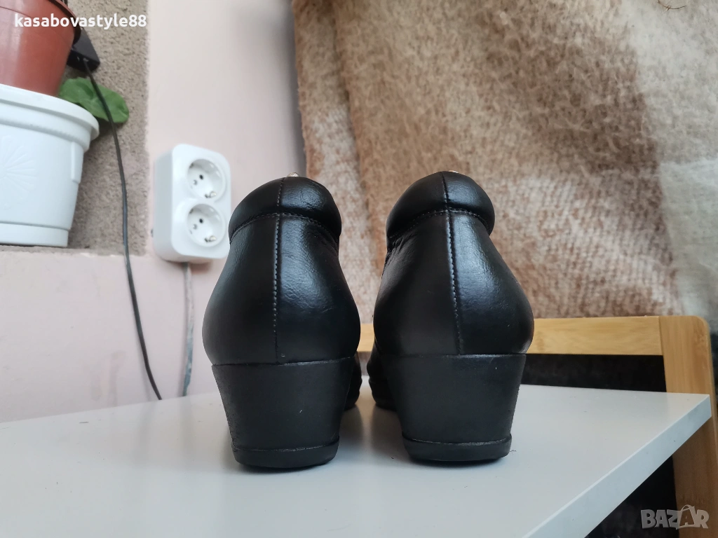 Дамски висококачествени комфортни обувки подходящи както за ежедневието така и за официални поводи. Перфектни както отвътре така и отвън. Изработени от естествена кожа, включително и вътрешната част. Отпред са декорирани с флорални копче. Разполагат с много мека подвижна стелка,която при нужда може да се вади,гарантирайки мекота и оптимална опора при движение Ток- 4 см а горната част-5.5см.Дължина на стелка 26.5-6см.
