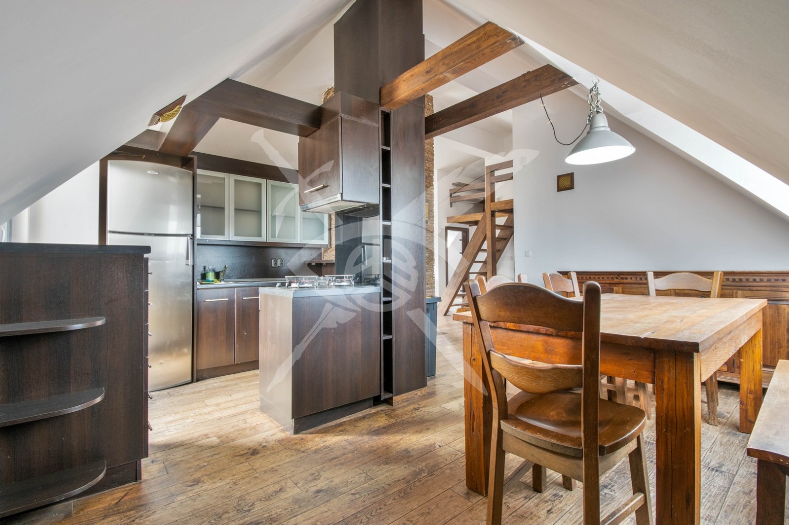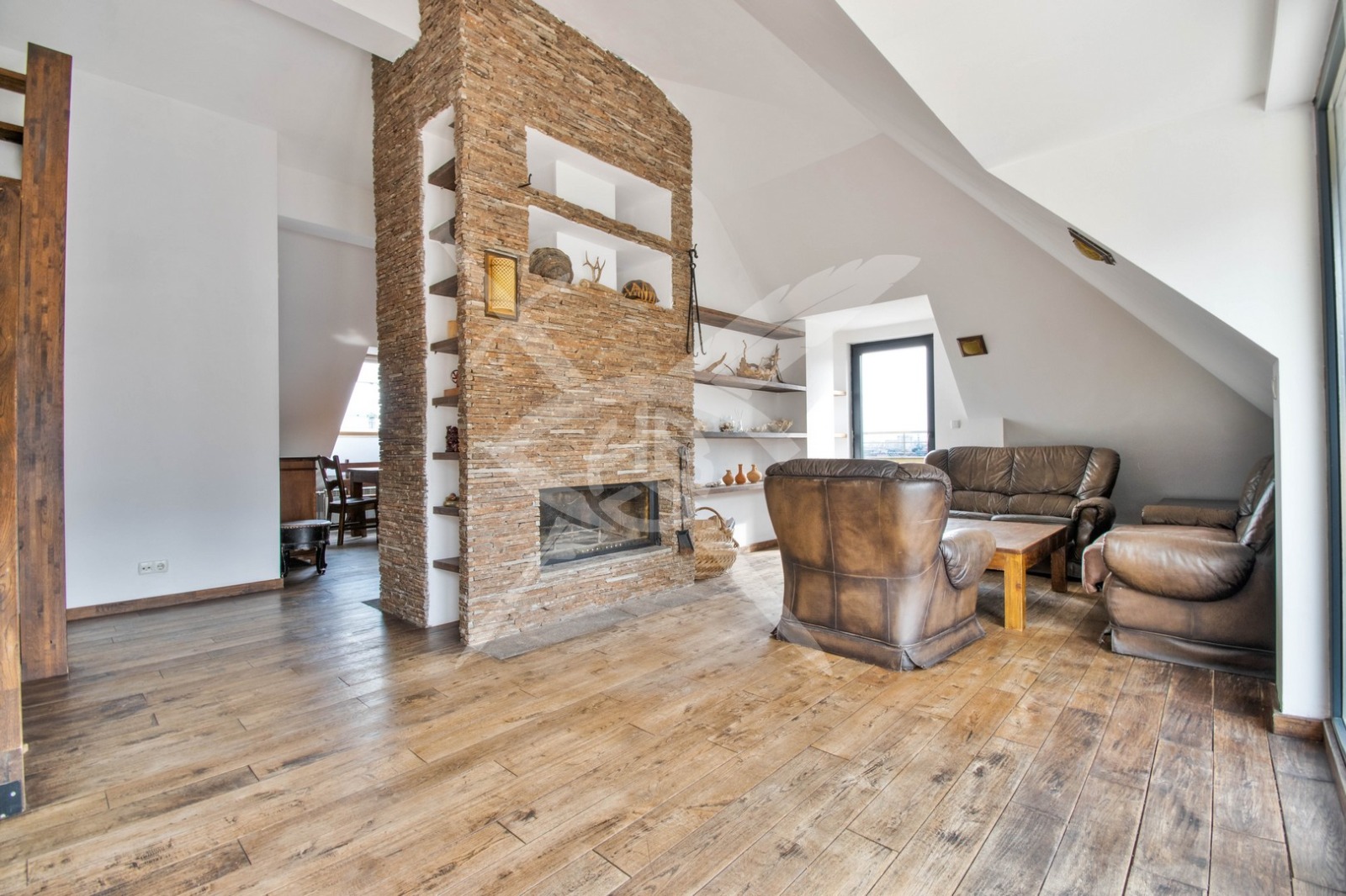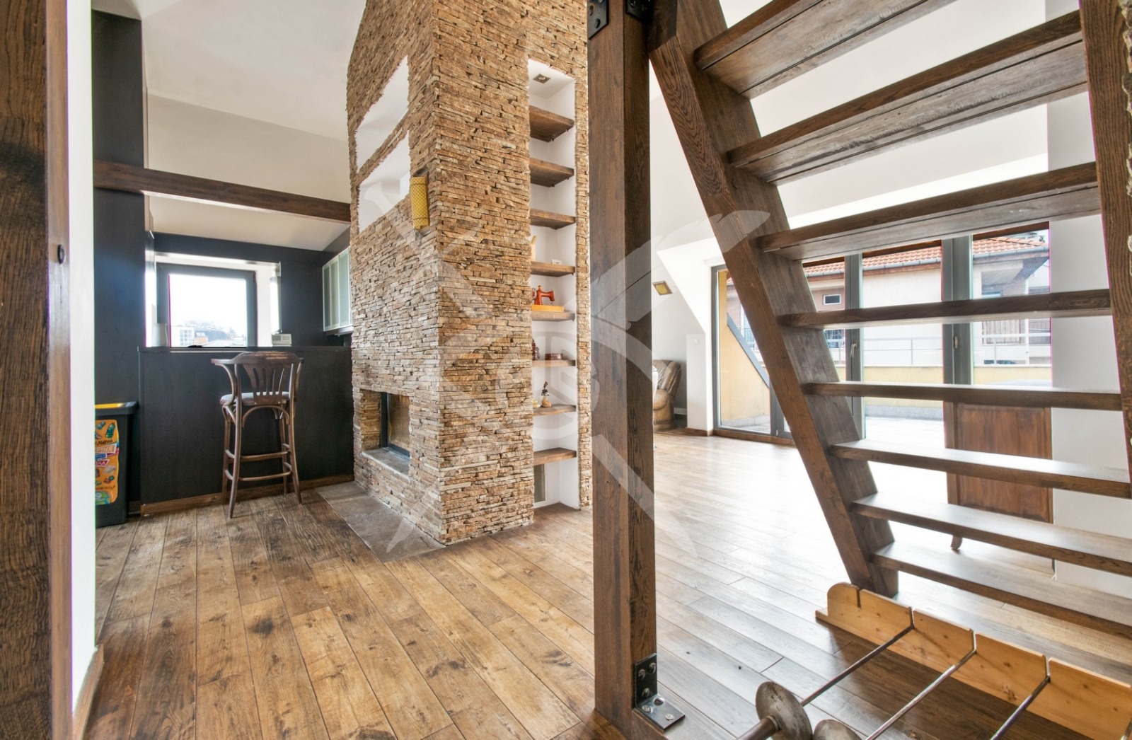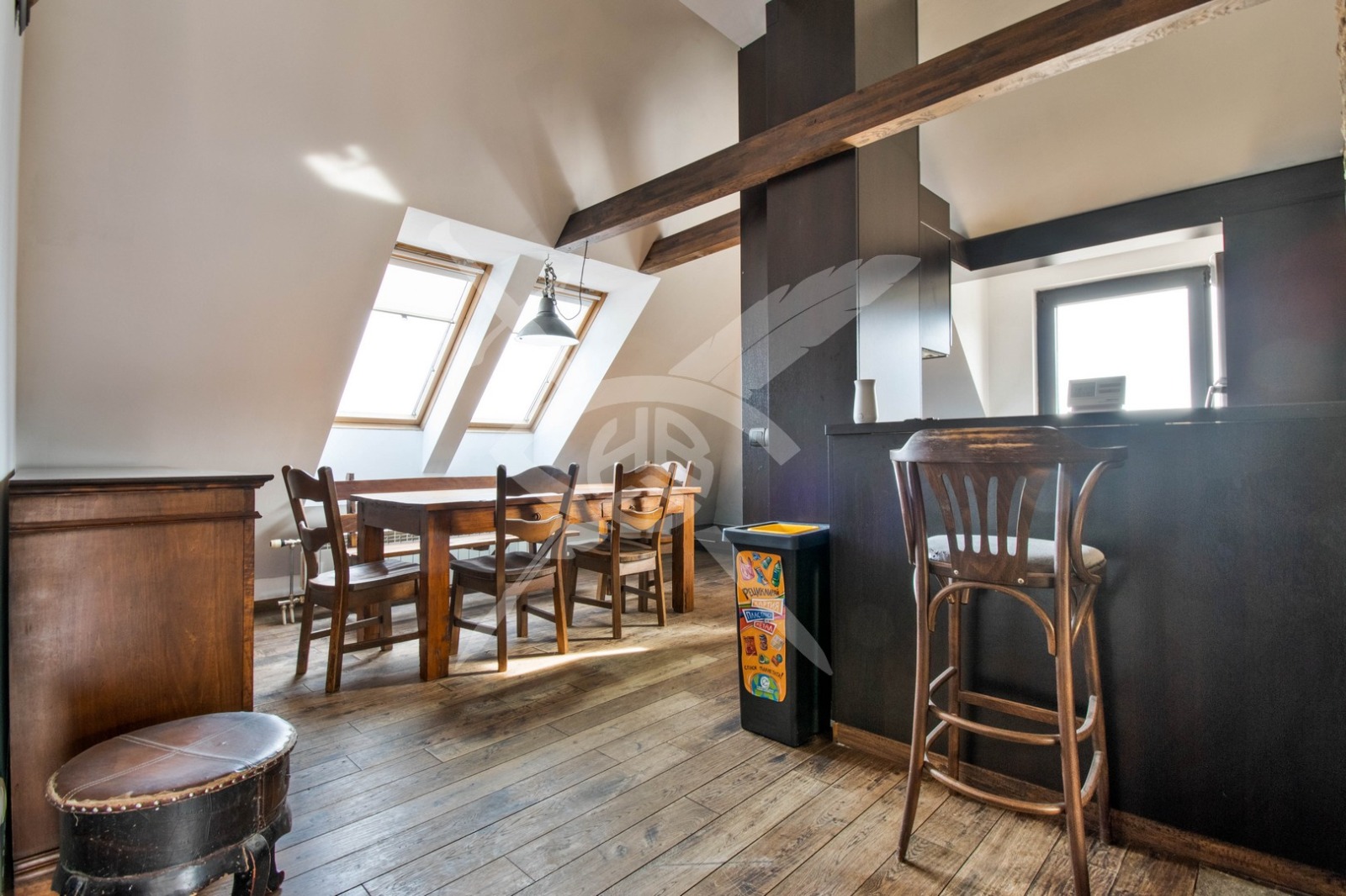 СЪСТОЯНИЕ: Имота е обзаведен с поръчково и изключително добре обработено естествено дърво, включително всички скринове, шкафове столове и маси в хола и трапезарията, както и цялата мансардна част.