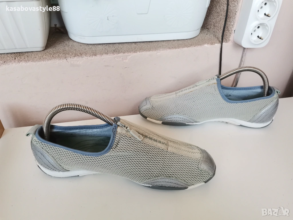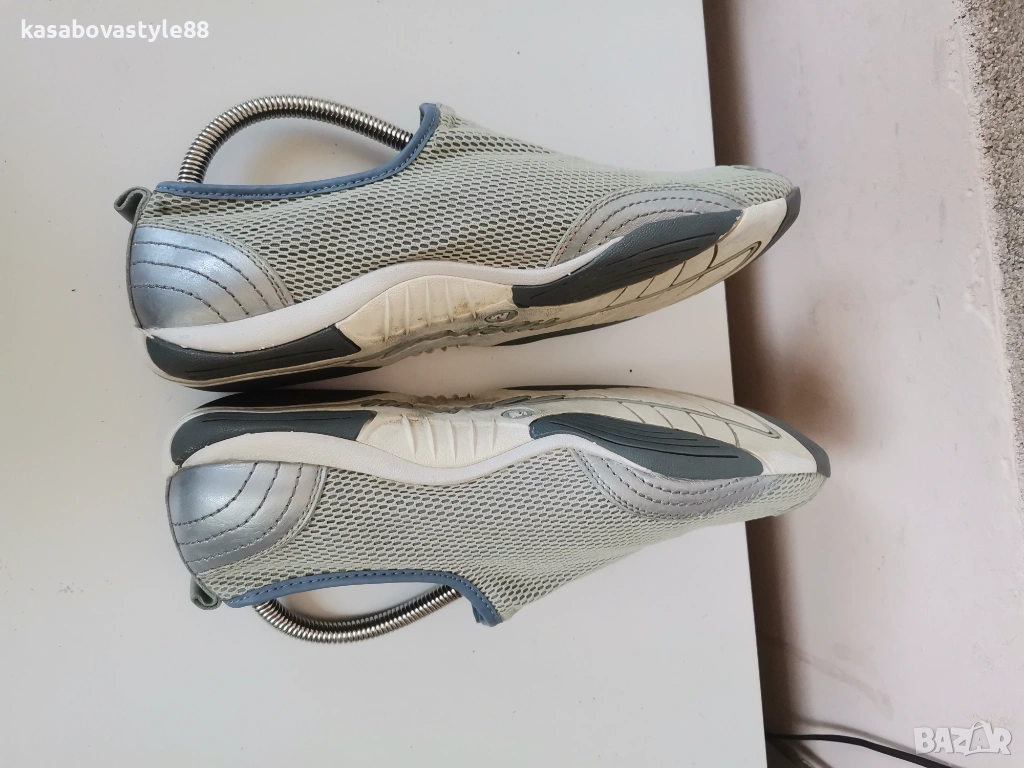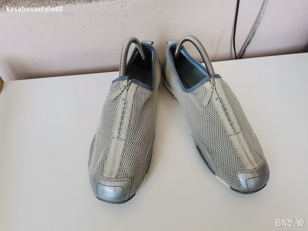 Леки и удобни дамски спортни обувки от разтеглива мрежеста материя и елементи от естествена кожа. В перфектно състояние.!! Обуват се лесно с цип в средата, съчетавайки стил и функционалност.. Ходилото е ултра гъвкаво и олекотено. Вътрешността е с вадеща и мека стелка от естествен материал. Отговарят на 40.5н.Дължина на стелка 26.5см.Височина отзад 7см.