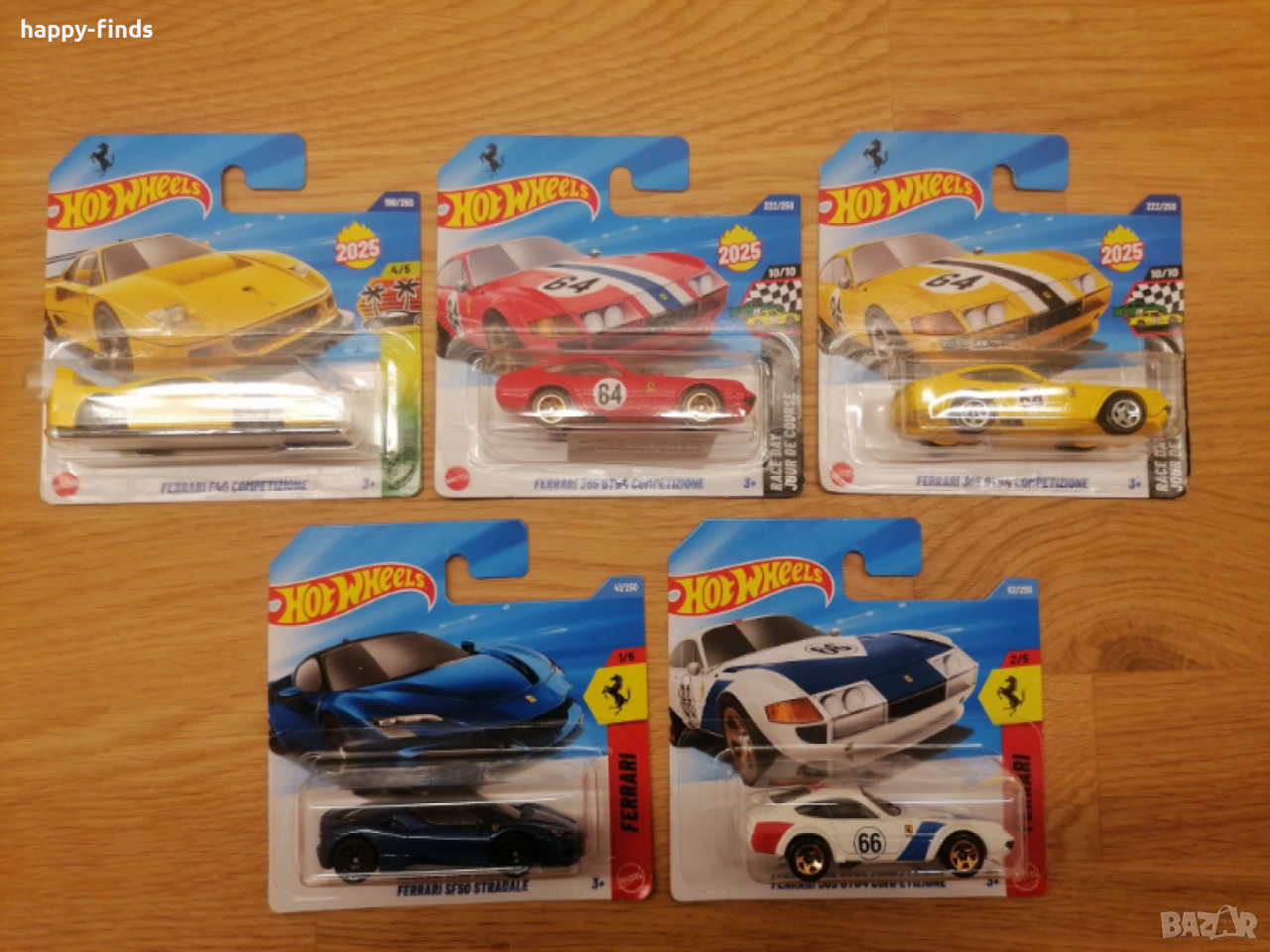 Състояние: Блистерите са отлично запазени, без пречупвания по картона или пукнатини по пластмасата. Моделите са с висока детайлност на тампопечата и оригиналните емблеми на Ferrari.