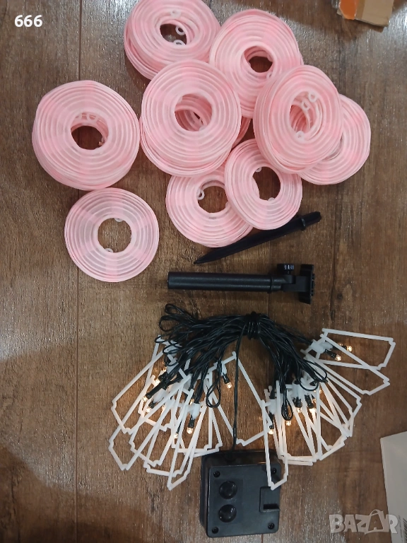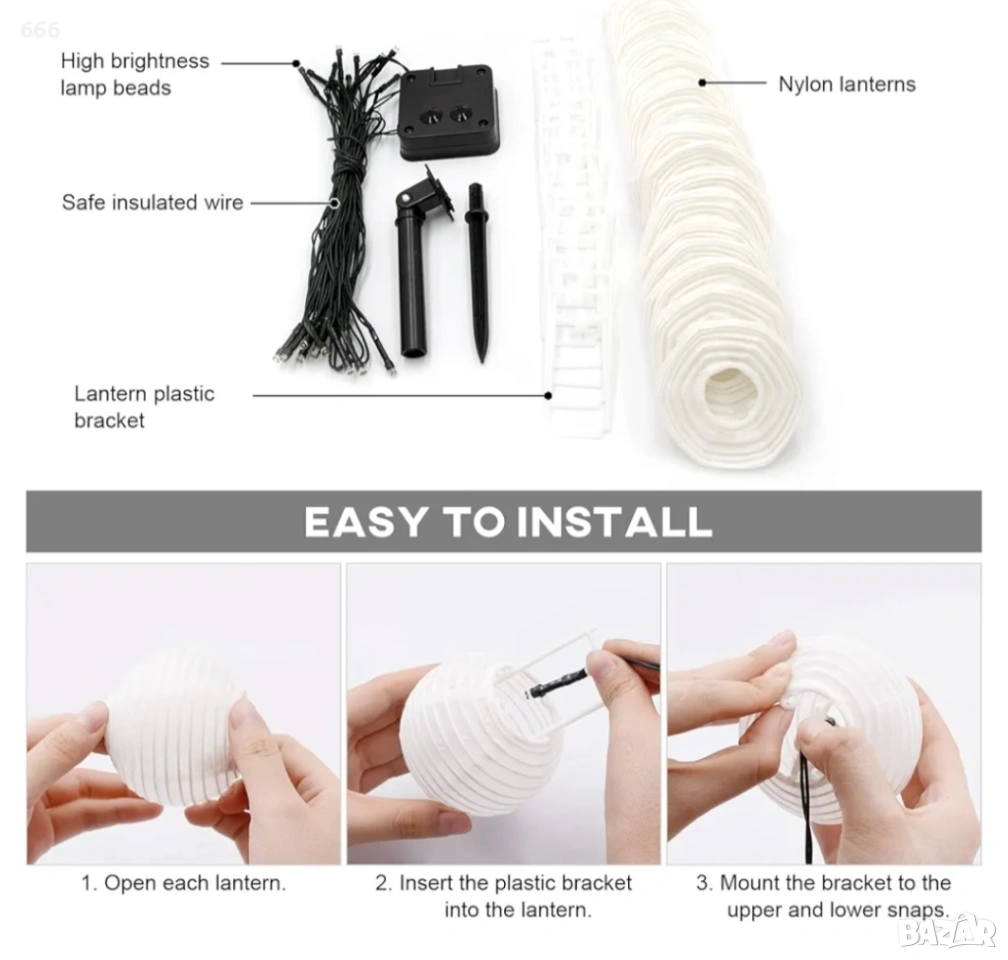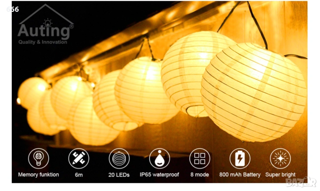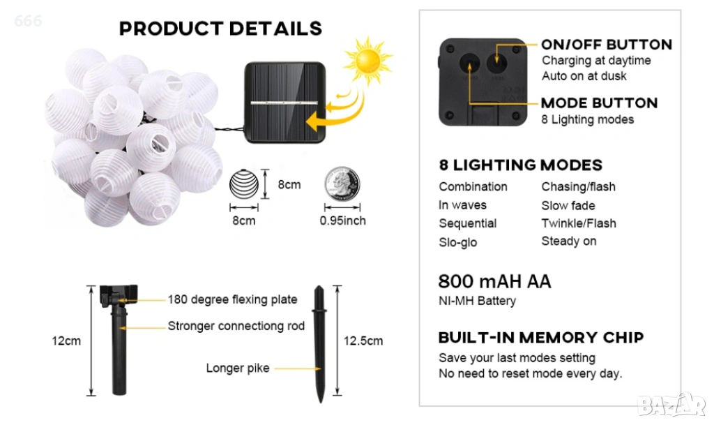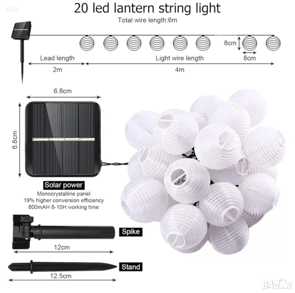 Дължината на кабела от слънчевия панел до първия фенер е 2 м, разстоянието между фенерите е 20 см, а общата дължина е 6 м.