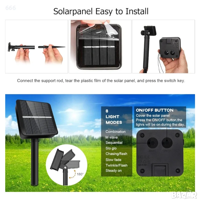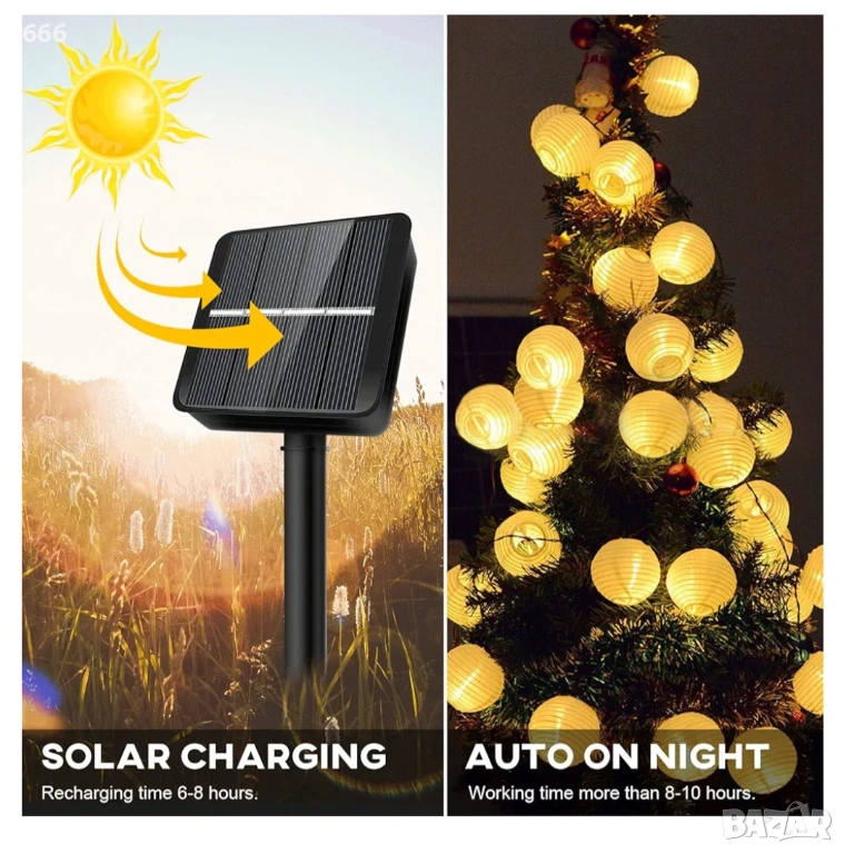 Външни слънчеви лампички: слънчевите лампички са енергоспестяващи, а презареждащите се слънчеви клетки с по-висок коефициент на преобразуване на енергия са екологични. С подобрения слънчев панел слънчевата светлина може ефективно да се абсорбира и преобразува в електрическа енергия. Автоматично се изключват сутрин и автоматично се включват привечер, като запазват последния настроен режим, без да е необходимо нулиране.