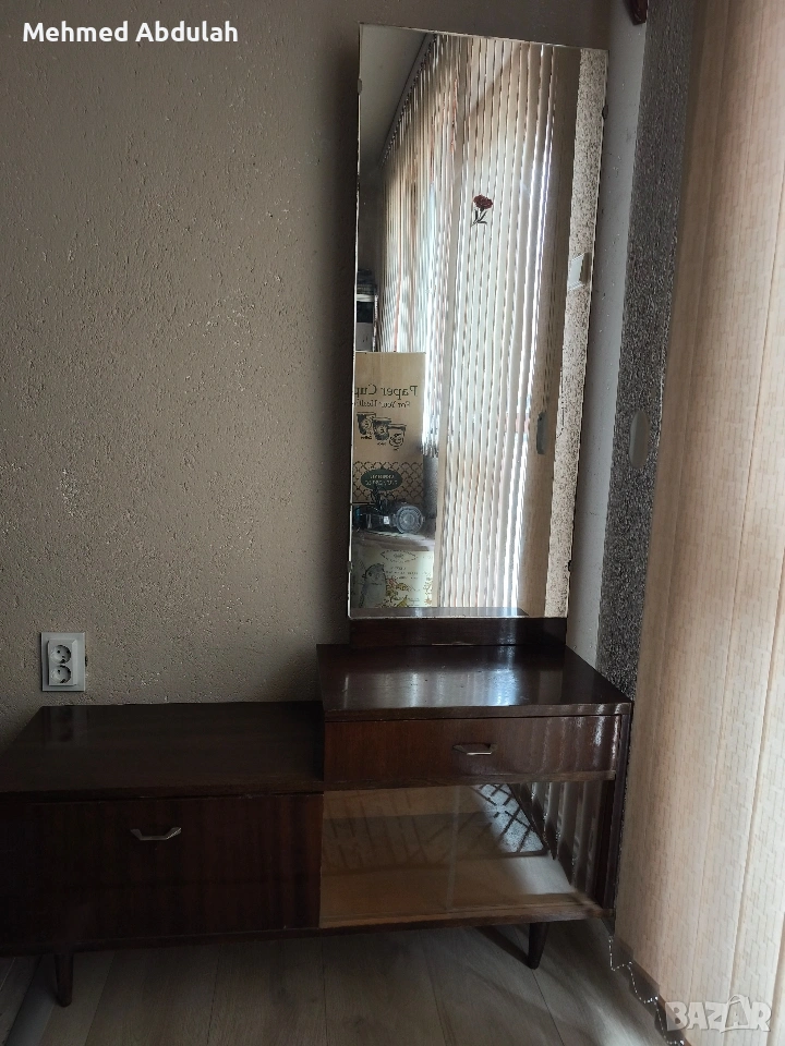 Продавам винтидж тоалетка в ретро стил от средата на миналия век. Изработена е от дърво с тъмен фурнир. Разполага с голямо, вертикално огледало, долен модул с чекмедже и шкаф, както и отворена ниша с рафт, осигуряващи достатъчно място за съхранение. В добро състояние с нормални следи от употреба. Подходяща е за спалня или декориране на пространство в ретро стил.