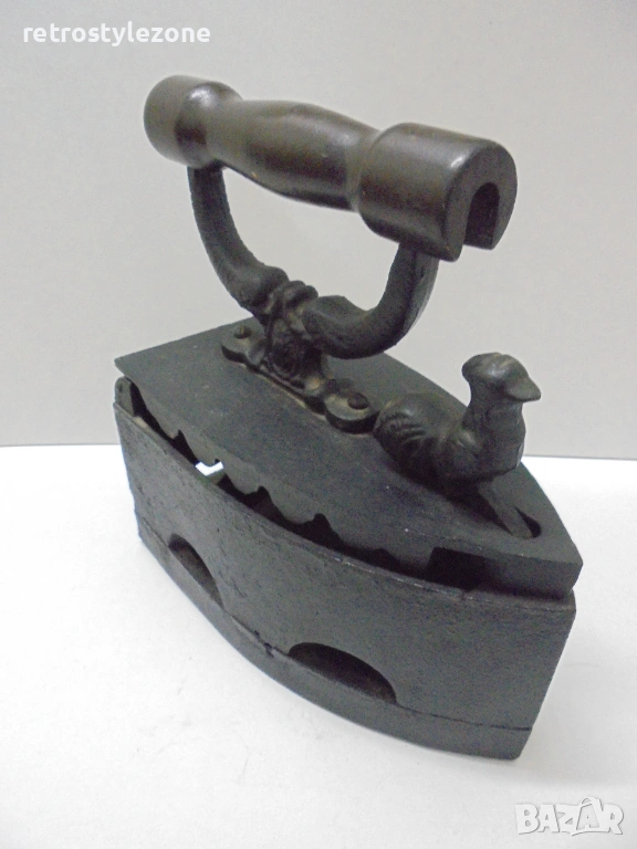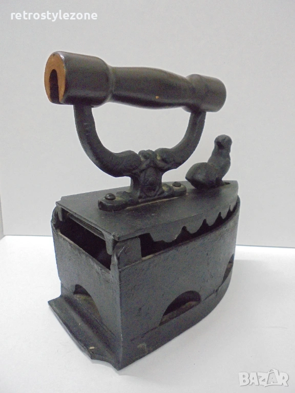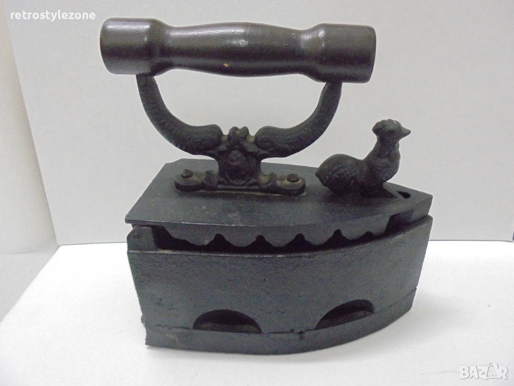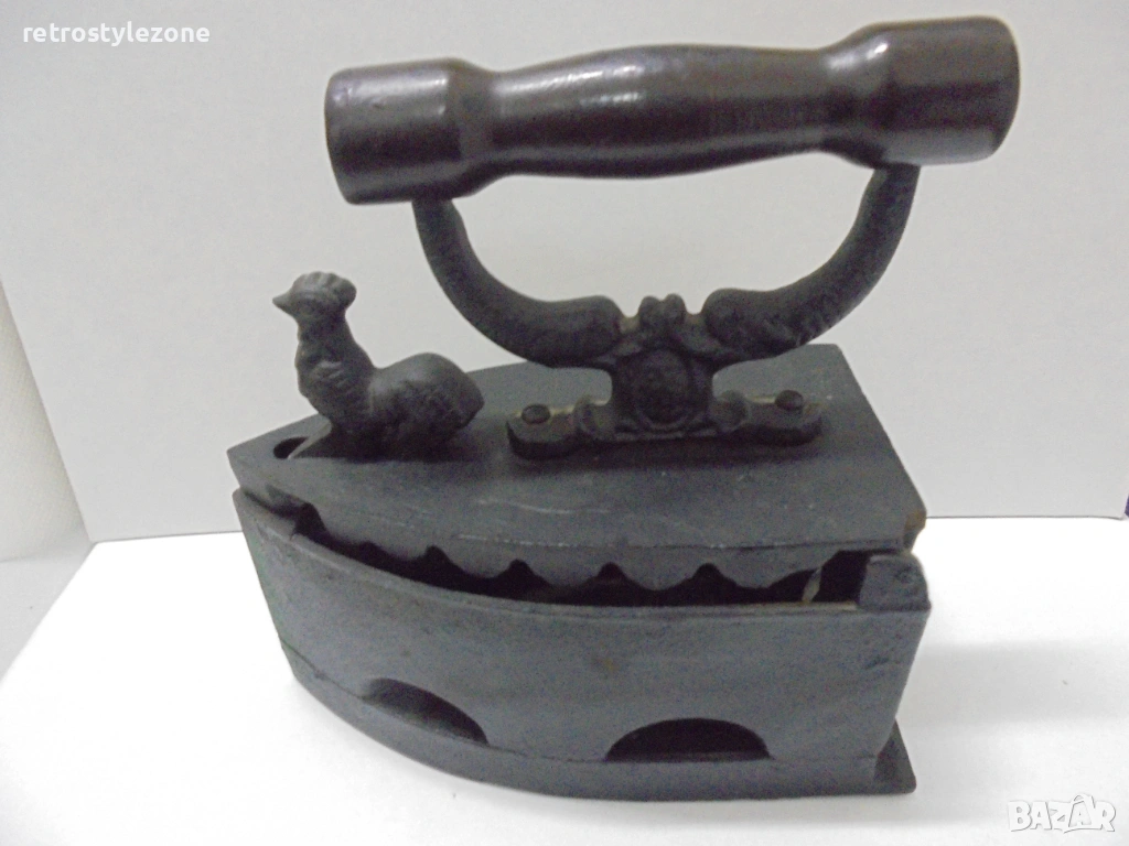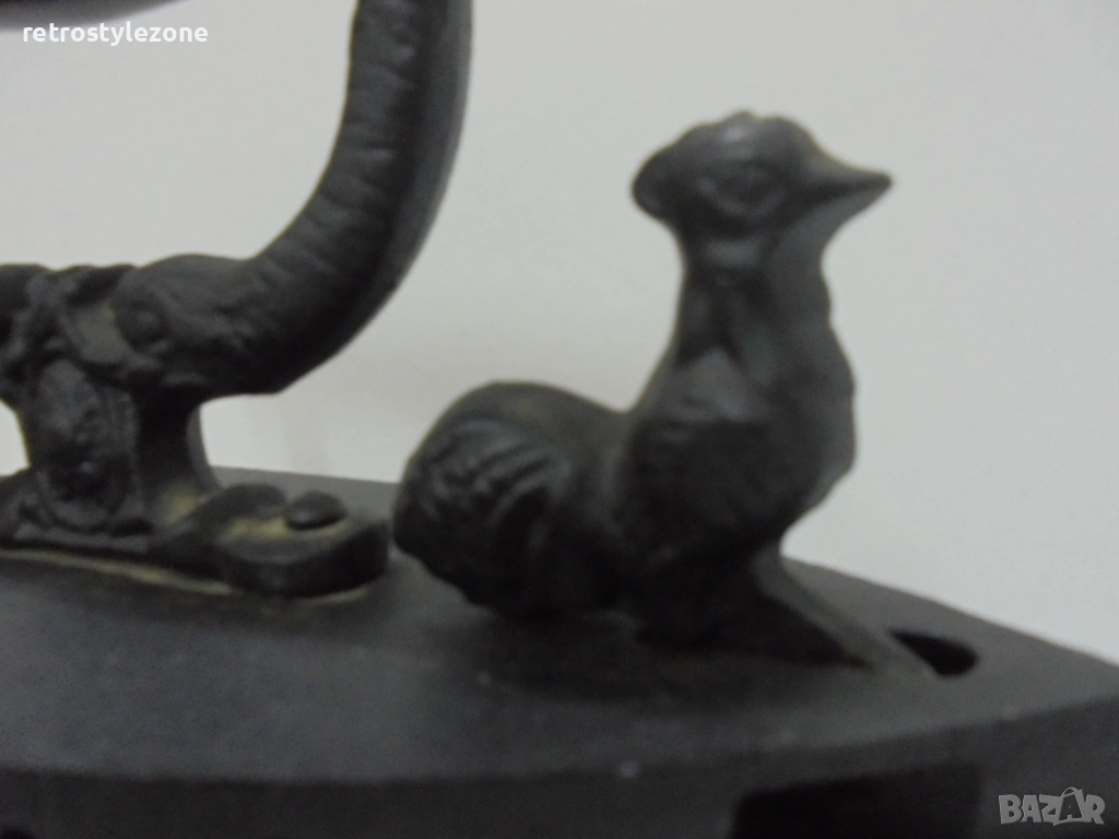 Автентична стара въгленова ютия, изработена от чугун, с характерен ретро дизайн и декоративна фигурка (петел) върху корпуса, придаващ допълнителна колекционерска стойност.