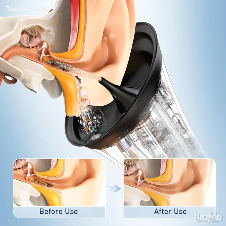 [Интегриран дизайн с два резервоара] - Нашата система за почистване на уши разполага с иновативен интегриран дизайн с два резервоара, осигуряващ по-удобно и безпроблемно почистване на ушите. За разлика от традиционните ушни миячки, които изискват изплакване, докато се опитвате да хванете мръсната вода с друга ръка, нашата ушна миячка е оборудвана с резервоар за чиста вода и отделен резервоар за събиране на мръсната вода, което прави процеса на почистване лесен и ефикасен.