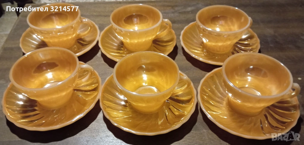 Сервиз от 12 части за кафе в златист цвят на марката Anchor Hocking. Съдовете са в добро състояние, мисля че никога не са ползвани, седяха като на изложба във витрината. Само лично предаване и лично опковане от купувача.