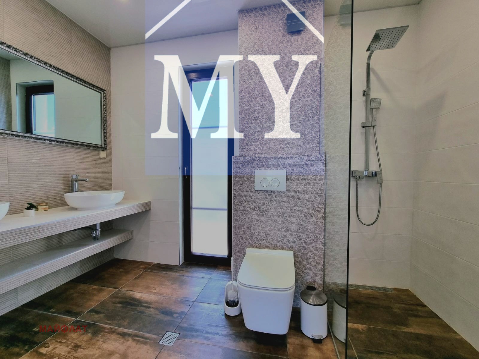 Горен етаж - Две спални, всяка със самостоятелна баня с тоалетна, обща тераса между двете спални.