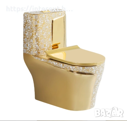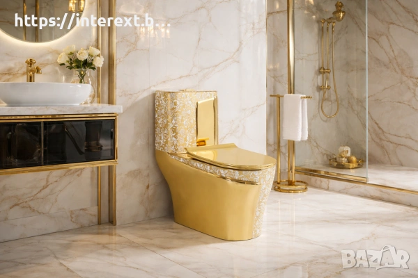 Луксозен дизайнерски моноблок със златисто покритие и декоративни елементи, който превръща банята в истинско интериорно бижу. Комбинация от впечатляваща визия, практичност и дълготрайна изработка. Повърхностите са гладки и лесни за почистване, а конструкцията е проектирана за дългогодишна употреба без компромис във визията.