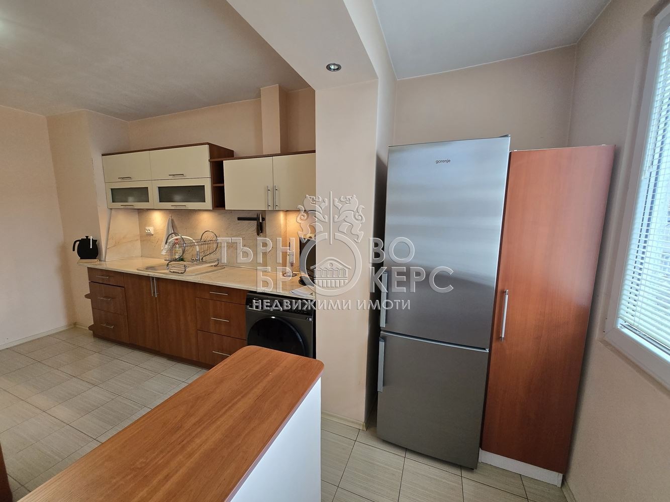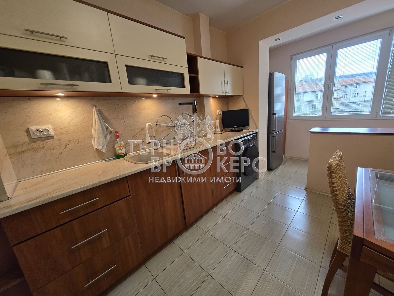 Екипът на Търново Брокерс Ви представя двустаен апартамент, находящ се в центъра на гр.Велико Търново. Жилището се състои от хол, спалня, кухня, баня и тоалетна, остъклена тераса и коридор. Имотът е изцяло обзаведен и е оборудван със следните ел.уреди: вградена фурна с котлони, хладилник, пералня,съдомиялна, два телевизора и два климатика.