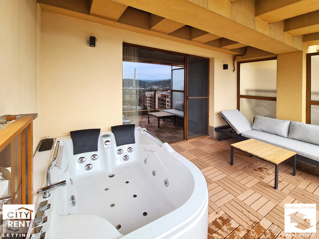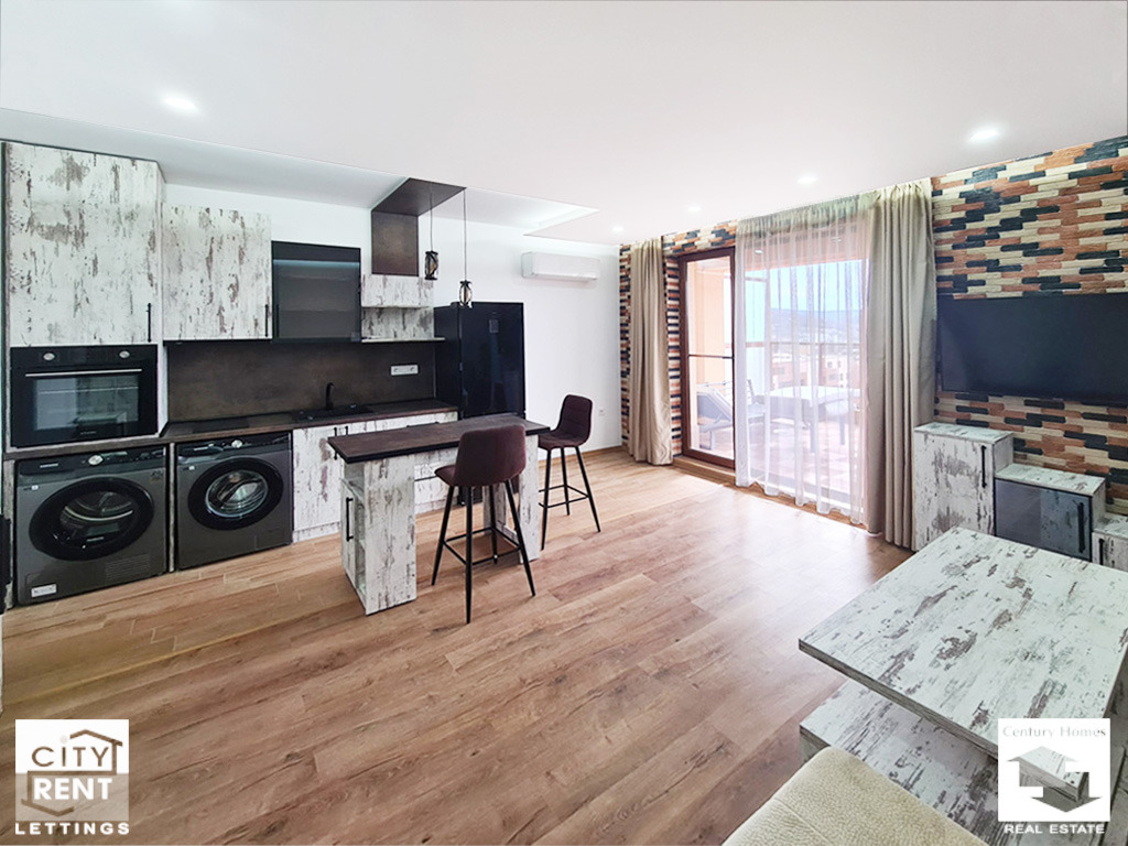 Жилището е с предпочитано западно изложение и е организирано като функционално отворено пространство, което съчетава комфорт и съвременен стил на живот. В него са обособени няколко зони напълно оборудвана кухня с вградена фурна, стъклокерамични котлони, абсорбатор, хладилник, пералня и сушилня; уютна трапезарна част за хранене; комфортен кът за отдих с мека мебел, масичка за кафе и телевизор; както и зона за сън с удобно двойно легло. Допълнително жилището разполага с входно антре, баня с тоалетна и просторна тераса, която е истинско продължение на дома и е обособена като прекрасно място за релакс, оборудвано с шезлонг и хидромасажна вана за двама. Отоплението е на ток, с климатик.