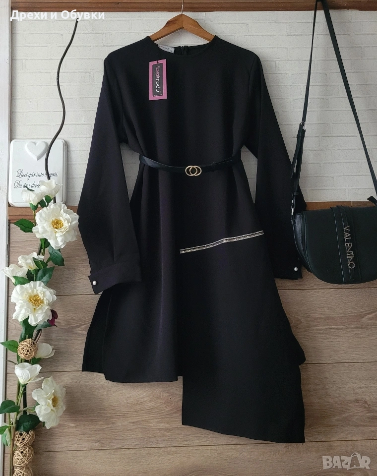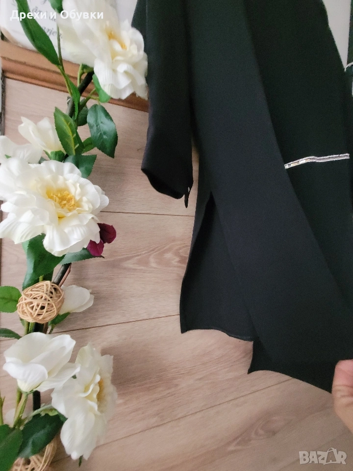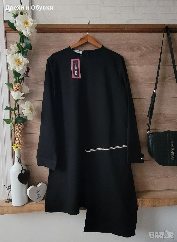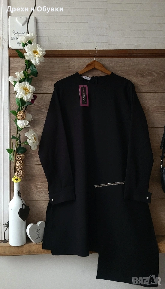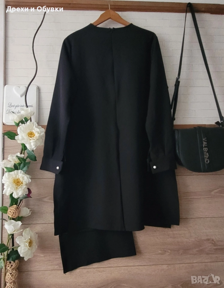Нова с етикет официална асиметрична четна туника FUVALMODA. Интересен разчупен модел! Елегантнаа лента с малки пайети създава загатващ лукс на същевременно изчистената линия на модела. Дълги ръкави завършващи с перлени копчета при китките. Странични цепки. Размер 48 ( 2ХЛ) Дълга 92см ( в цялата къса част). Гръдна 116см Цена 30€