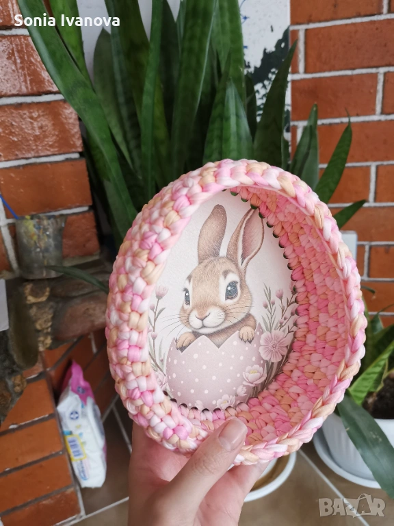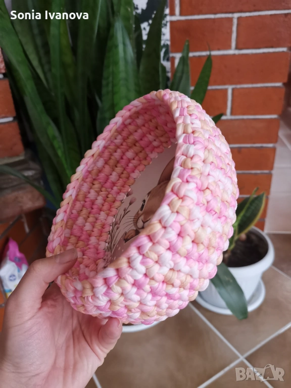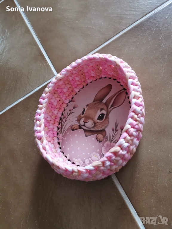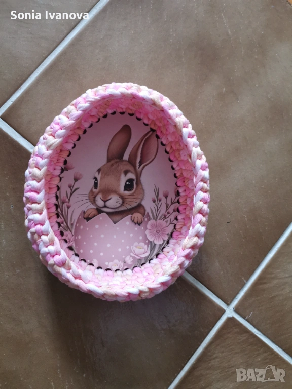 Панер с мотиви на зайче. Дъно с форма на яйце. Ръчна изработка. Може да се изработи и в кръгла форма. Размери: 18/15/7 (Д/Ш/В)