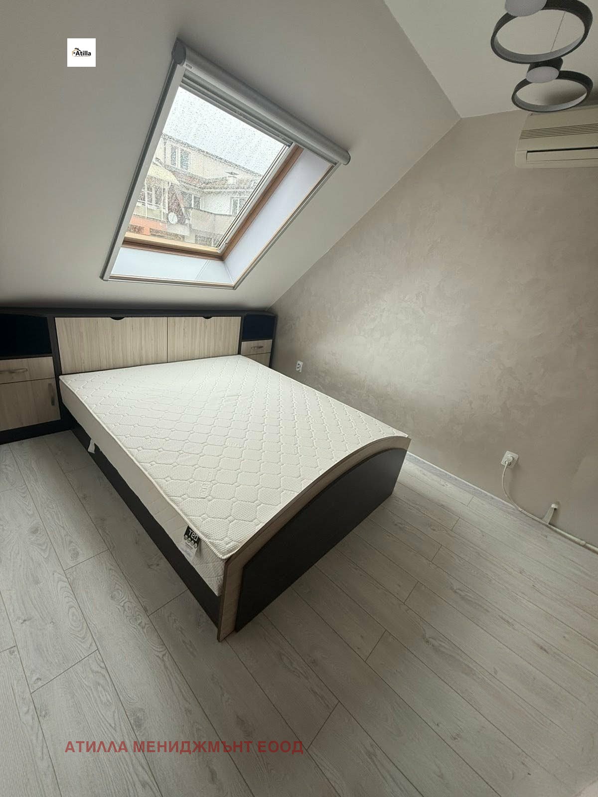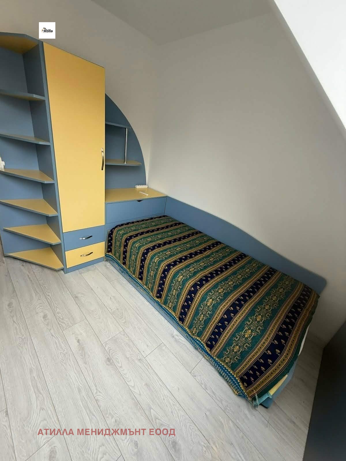 Разпределението включва две спални - основна комфортна спалня и втора стая с единично легло, гардероб и шкафове, подходяща за дете, гост или офис.