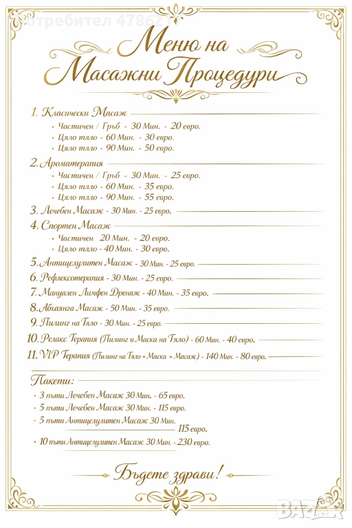 Цени- 30 Мин. - 20 евро, цяло тяло 60 Мин - 30 евро, 90 Мин. - 50 евро.
