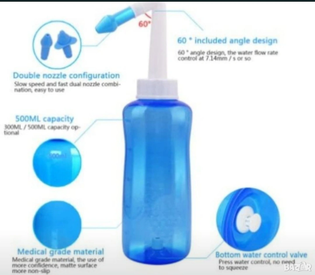 Главата трябва да е правилно наклонена над мивката - лицето да полегне върху рамото почти на 90% спрямо тялото, като така се предотвратява навлизане на вода в гърлото. Чре натискане бутона в дъното на бутилката се осигурява непрекъснат промиващ поток. Водата влиза през едната и излиза през другата ноздра.