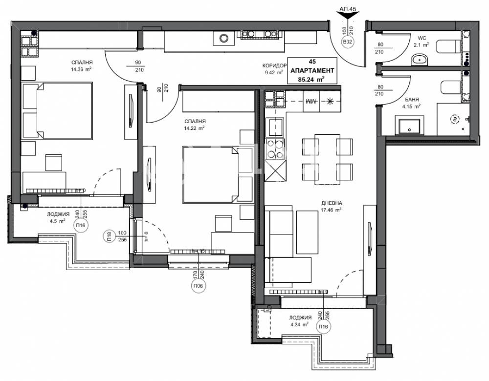 Тристаен апартамент с РЗП- 102,42м?, ЗП-85,24м? с включен склад 45 -2,37 м?. Разпределение: коридор, дневна с кухненски бокс и трапезария, две спални, баня с тоалетна, отделна тоалетна, две лоджии. Отопление ТЕЦ. Изложение -ЮГ.