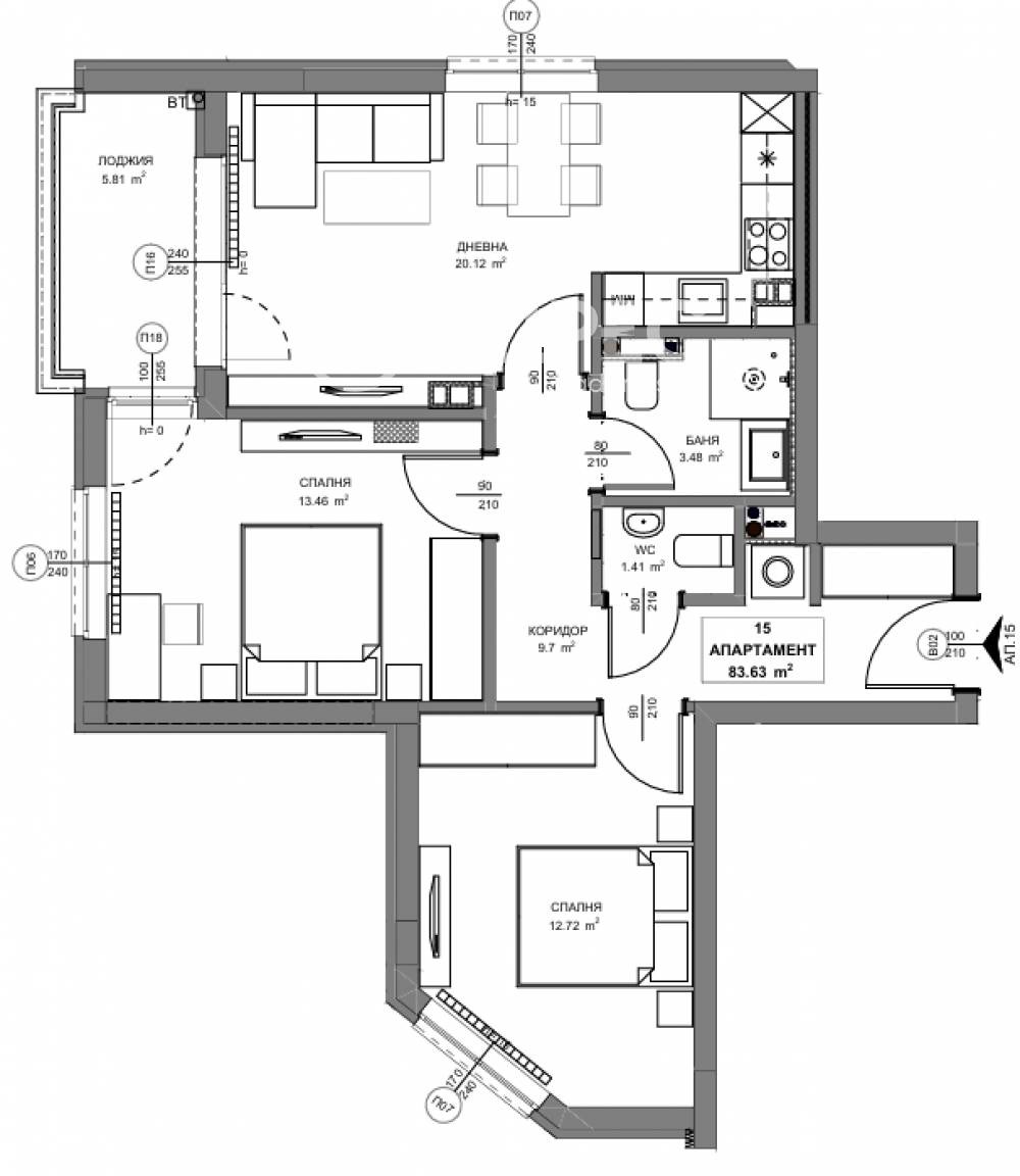 Тристаен апартамент с РЗП- 100,74м?, ЗП-83,63м? с включен склад 15 -2,37м?. Разпределение: коридор, дневна с кухненски бокс и трапезария, две спални, баня с тоалетна, отделна тоалетна, лоджия. Отопление ТЕЦ. Изложение -ЮГ /ЗАПАД/СЕВЕР.