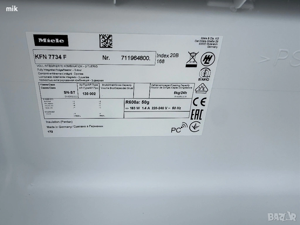 Хладилник с фризер за вграждане Миеле No Frost - система. Закупен от Германия. Дезинфекциран и готов за употреба