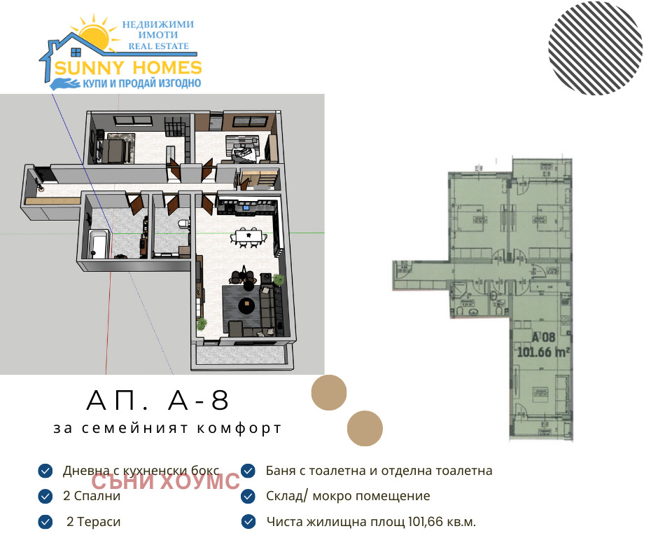 Имотът е с обща квадратура 112,82 кв. м. Чистата жилищна площ е 101,66 кв. м. разпределени между: просторна всекидневна и кухненски бокс в един обем, две спални, баня с тоалетна, тоалетна, коридор, тераса, склад/ мокро помещение.