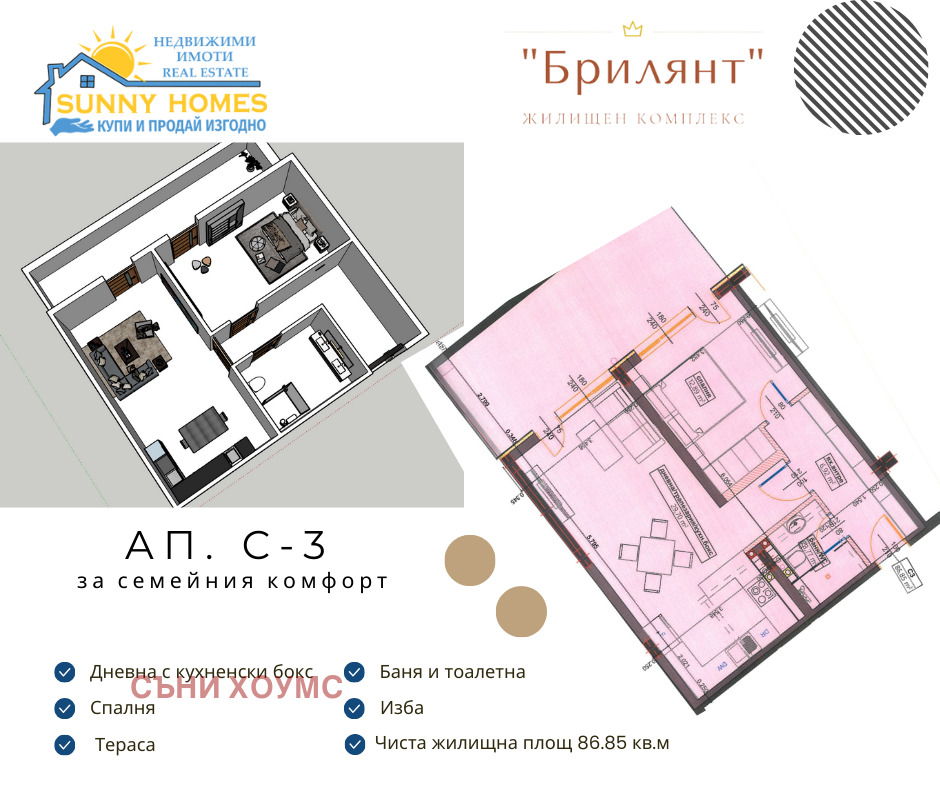 Имотът е с обща квадратура 103,79 кв. м. Чистата жилищна площ е 86,85 кв. м. разпределени между: просторна всекидневна и кухненски бокс в един обем, една спалня, баня с тоалетна, коридор, тераса. Към имота има избено помещение с площ 4,59 кв. м.