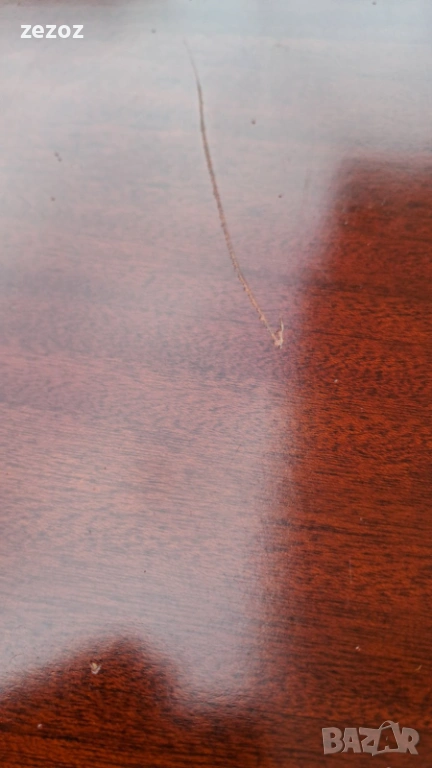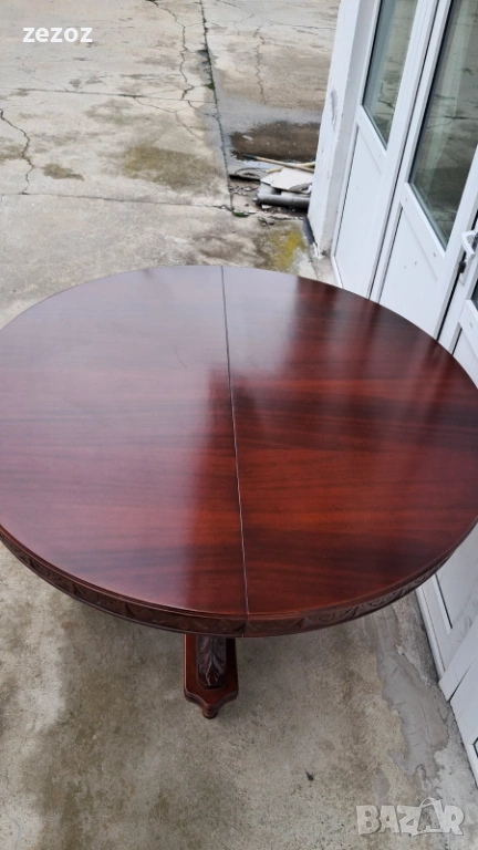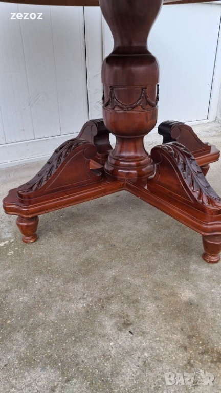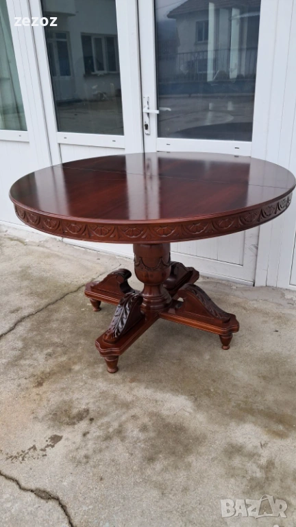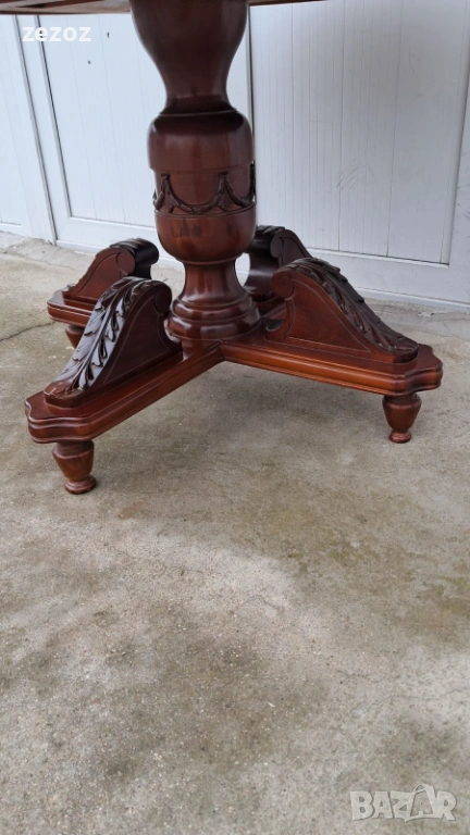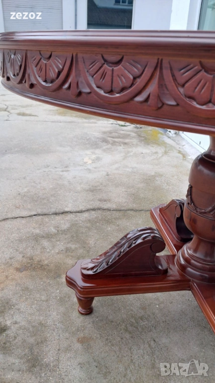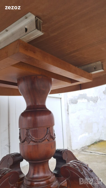 Ретро трапезна маса изработена от масив.Централен пиедестален крак с четири опори украсени с декоративни елементи.По-принцип масата е разтегателна,но липват разпънките.Дърворезба по борда на плота.Масата е конструктивно здрава с леки забележки по плота,видими на снимките.Размери-