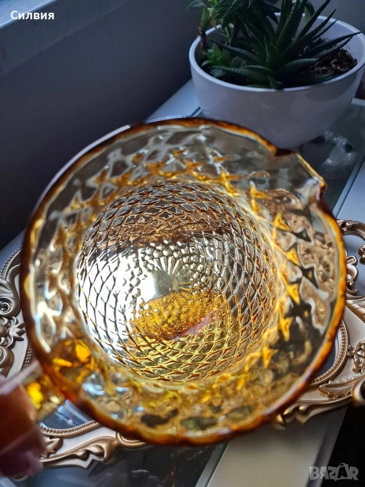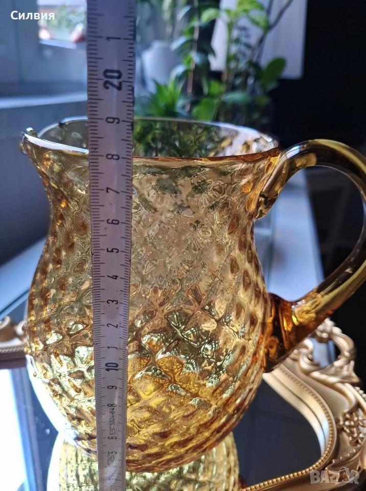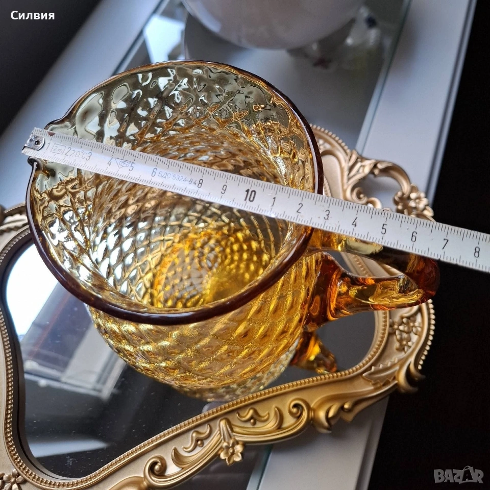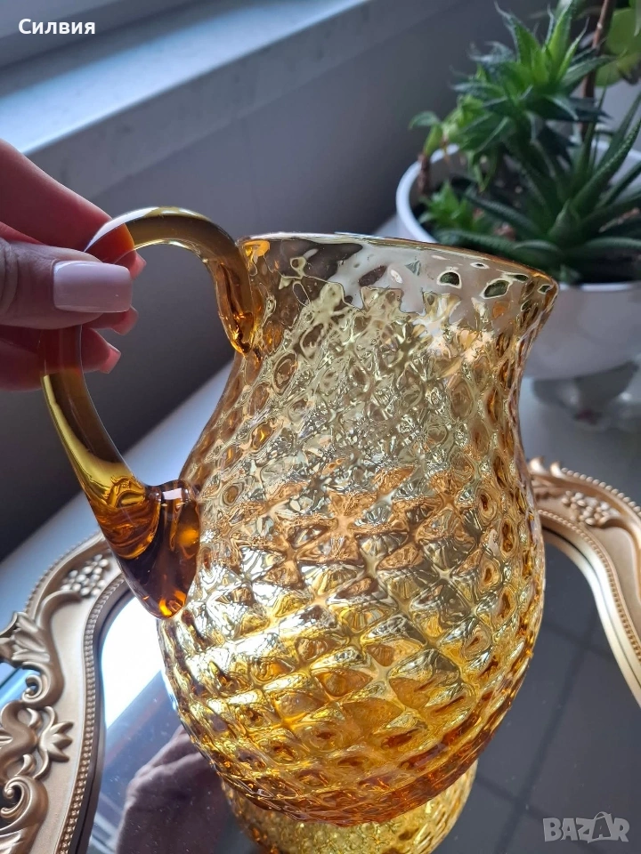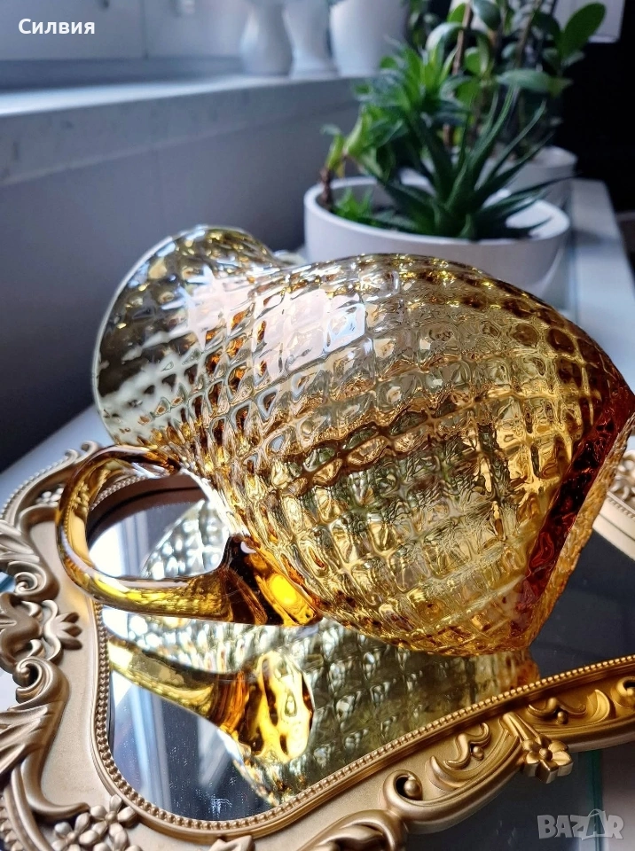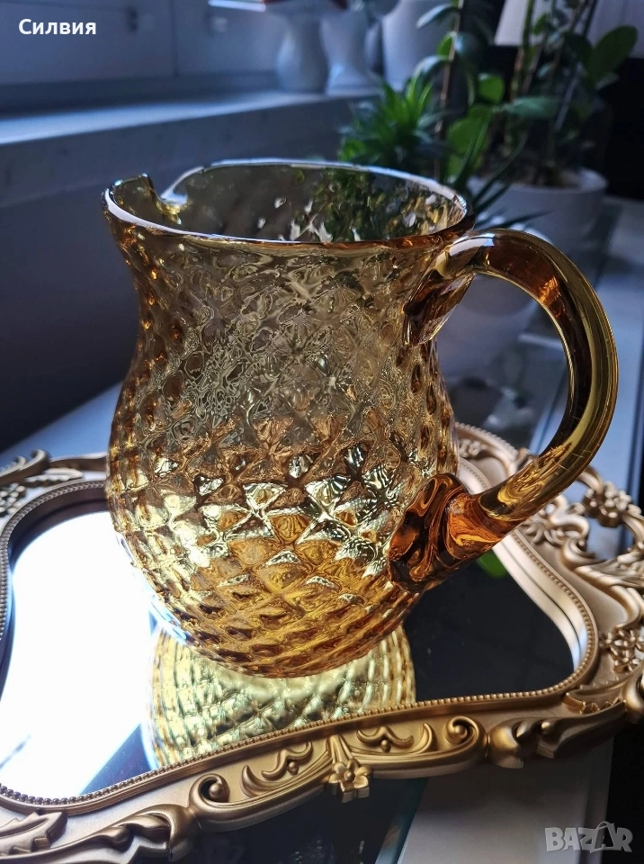 Кехлибарена кана „Hobnail“ – Ретро изящество и блясък. Стъклено бижу, което носи духа на миналия век и аристократичен уют. Тази прелестна кана е изработена от масивно, висококачествено стъкло в топъл кехлибарен цвят (Amber), който улавя и пречупва светлината по магически начин. Дизайн: Класически стил „Hobnail“ (диамантени точки), характерен за престижните производители на стъкло от средата на 20-ти век (като Fenton или Anchor Hocking). Наситено златист кехлибарен цвят, който прелива в по-светли нюанси при излагане на пряка светлина. Форма: Елегантна крушовидна форма с извита, масивна дръжка, осигуряваща стабилност и комфорт. Състояние: Безупречно антикварно състояние – без чипове или пукнатини. Изключително запазена повърхност с висок гланц. Вместимост около 1,5L Тази кана не е просто съд за сервиране, а декоративен акцент, който внася тежест и стил във всеки интериор. Цена 6️⃣0️⃣€ 《117,35лв 》 •✽✧✽•°”˜🦋”°•✽✧✽•°”˜🦋”°•✽✧✽•°”˜🦋”°•✽✧✽•°”🦋˜”°•✽✧✽•