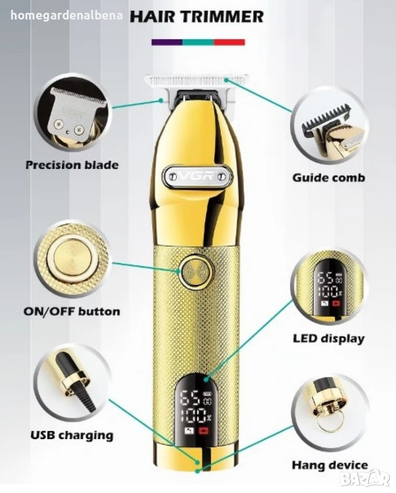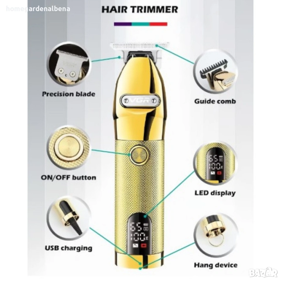 Home&Garden by Albena представя професионалната машинка VGR с 40 мм Т-образно острие – прецизна, ергономична и с елегантен дизайн. Подходяща както за салони, така и за лична употреба, идеална за подстригване, контур на брада и тяло, с дълготрайна автономност и лесно зареждане.