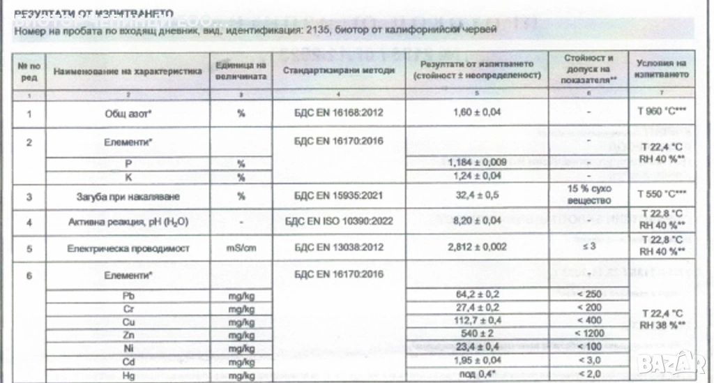 β’ ΠΡΠΎΡΠΎΠΊΠΎΠ» Π·Π° ΠΈΠ·ΠΏΠΈΡΠ²Π°Π½Π΅ Π½Π° ΠΎΡΠ³Π°Π½ΠΈΡΠ΅Π½ ΡΠΎΡ: ΠΠΠ‘ EN 16168, ΠΠΠ‘ EN 16170, ΠΠΠ‘ EN 15935, ΠΠΠ‘ EN ISO 10390, ΠΠΠ‘ EN 13038, ΠΠΠ‘ EN 16170.