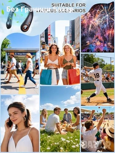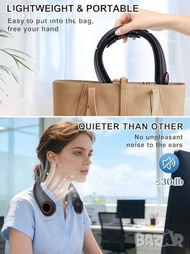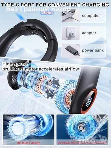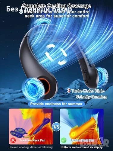 Безжичен вентилатор за врат с 3 турбини за силно и равномерно охлаждане