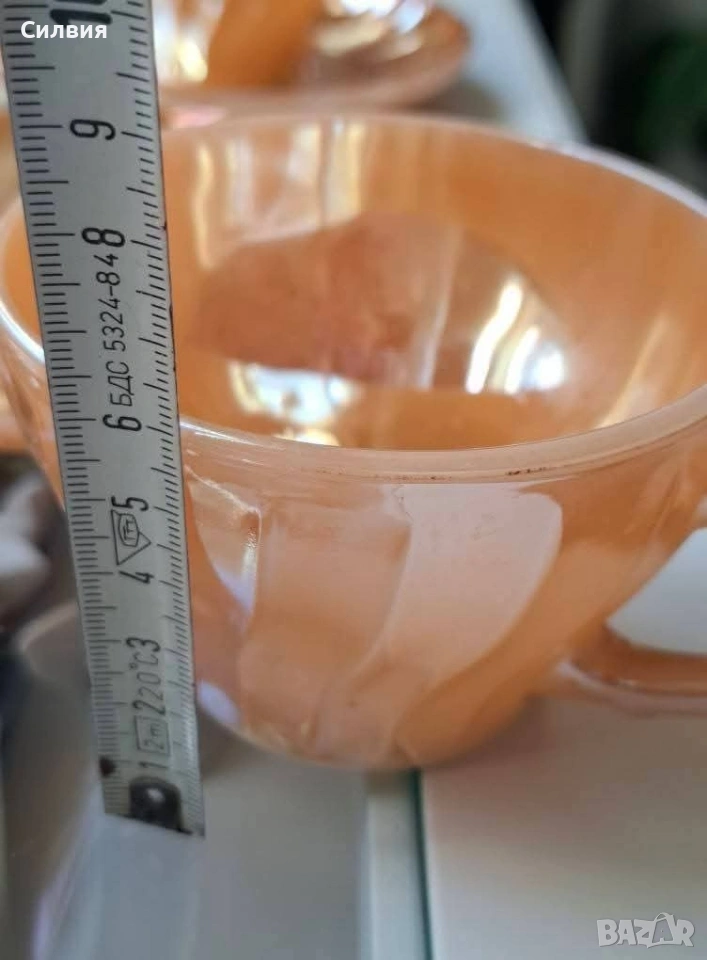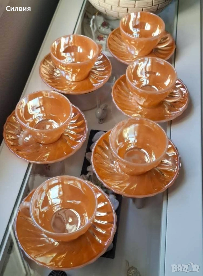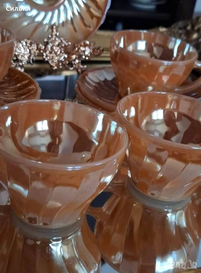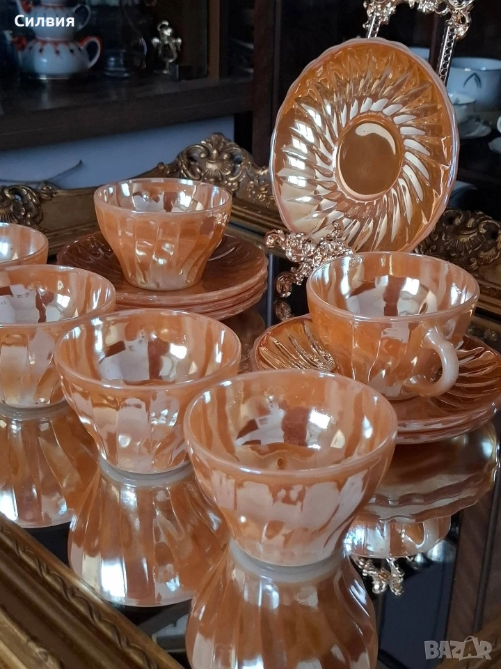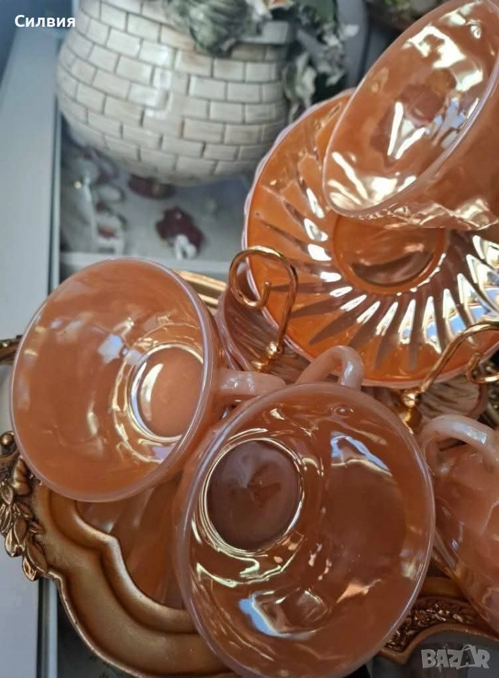 Винтидж комплект Anchor Hocking Fire-King Комплект от 6 чаши с чинийки – изработени от прочутото огнеупорно стъкло Fire-King на Anchor Hocking. Комплектът впечатлява с релефни лъчи по чинийките и фин гофриран рисунък на чашите, които улавят светлината и преливат в топли нюанси. Вместимост на чашите: 200 мл – перфектни за кафе, чай, горещ шоколад или ароматно капучино. Нежният прасковен цвят с перлен блясък и релефен слънчев орнамент придават неповторим ретро чар. Идеален избор за колекционери, ценители на американски винтидж дизайн или като ефектен акцент в дома. Истинска класика от средата на XX век – красота и история в едно с нежно прасковено стъкло с перлен, лъчезарен отблясък. Идеален за колекционери, любители на винтидж стила или като изискан акцент в ретро интериор. Една истинска находка за ценители на ретро стъкло от средата на XX век. •✽✧✽•°”˜🦋”°•✽✧✽•°”˜🦋”°•✽✧✽•°”˜🦋”°•✽✧✽•°”🦋˜”°•✽✧✽•